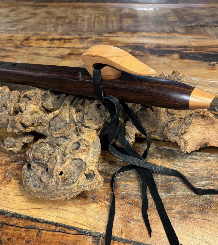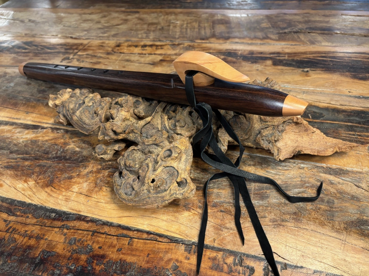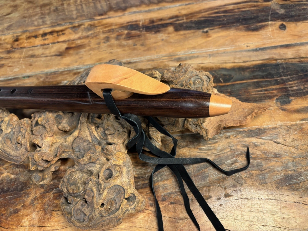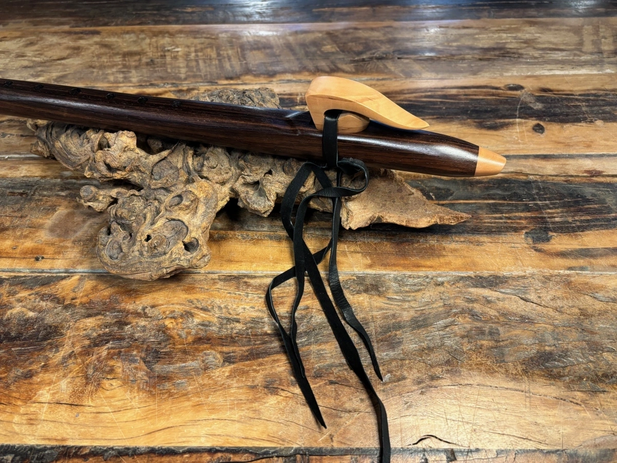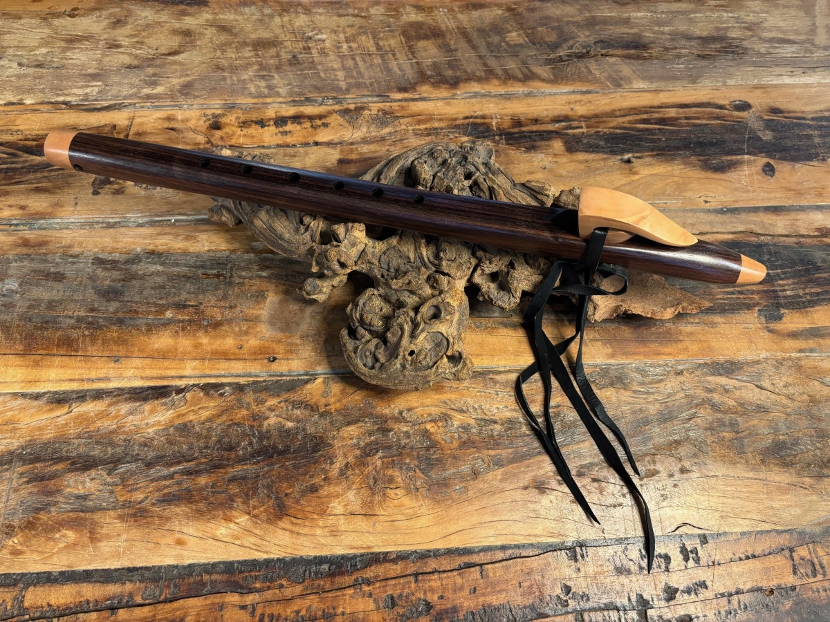 Entdecke die handgefertigte Gebetsflöte von Miguel Medina aus Palisander mit African Pear Akzenten. Harmonisch ausbalanciert, 55 cm lang und 22 mm innen.