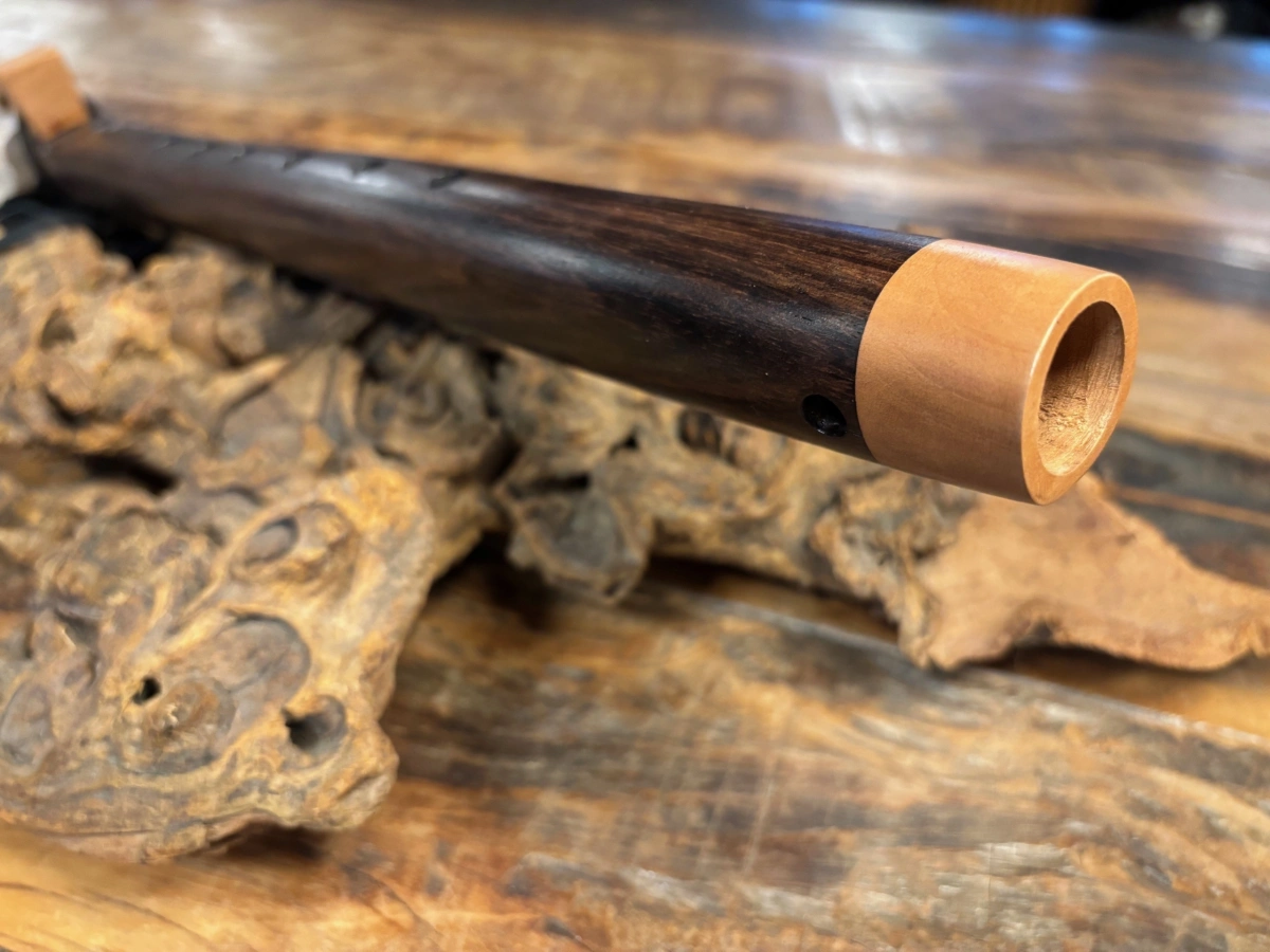 Diese handgefertigte Gebetsflöte von Miguel Medina ist ein Meisterstück voller Detailtiefe, Seele und kunstvoller Präzision. Der Flötenkörper aus Palisander besticht durch seine dunkle, fast violett schimmernde Maserung, während African Pear einen hellen, lebendigen Kontrast setzt. Der stilisierte Windblock vervollständigt die harmonische Optik dieses aussergewöhnlichen Instruments.