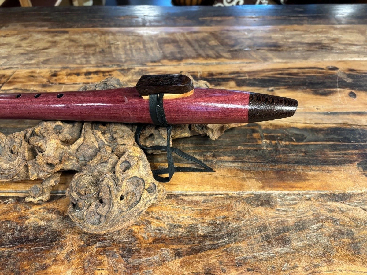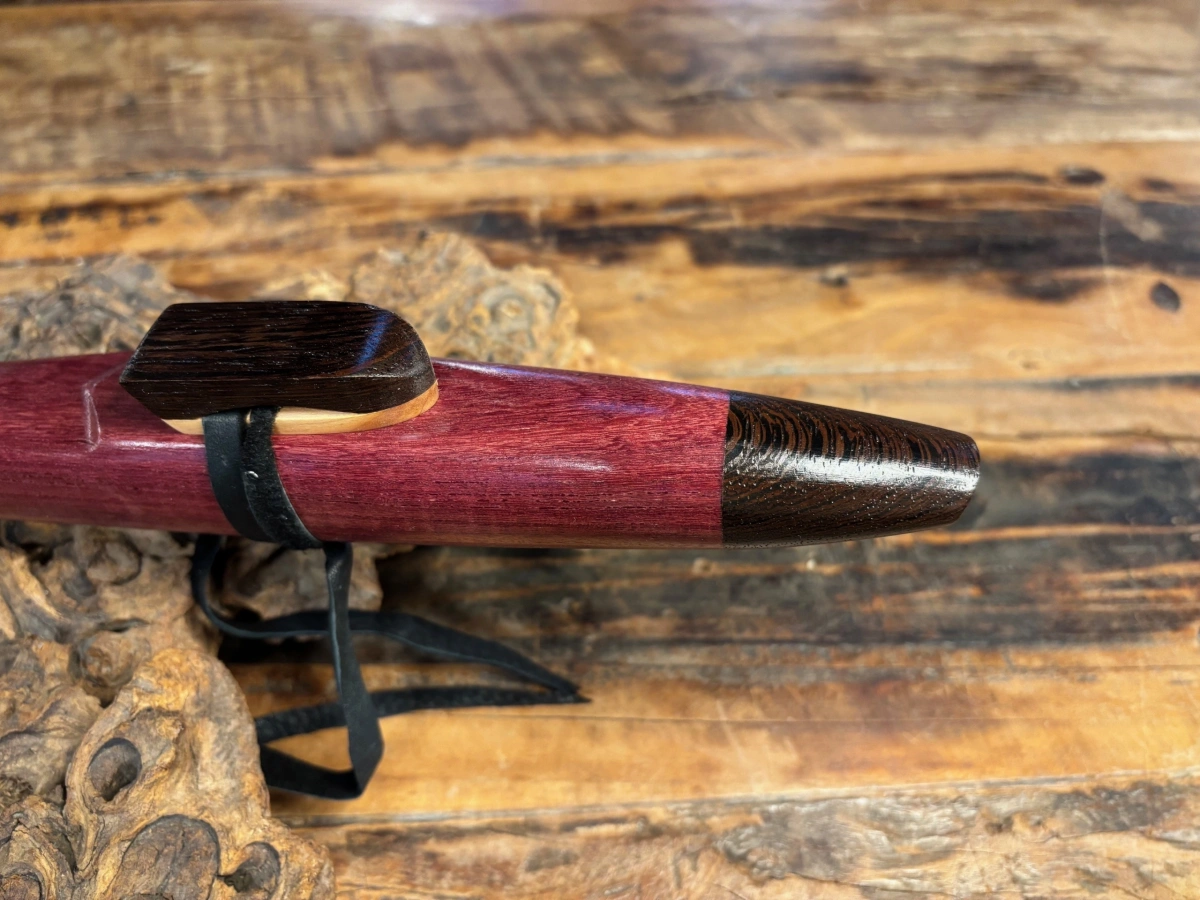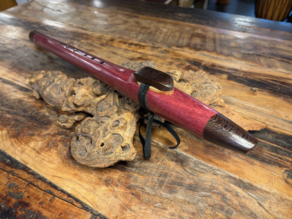 Entdecke die handgefertigte Gebetsflöte aus Purpleheart mit Wenge-Akzenten in E-Moll von Miguel Medina. 63,5 cm Länge, 25 mm innen. Klarer, warmer Bassklang!