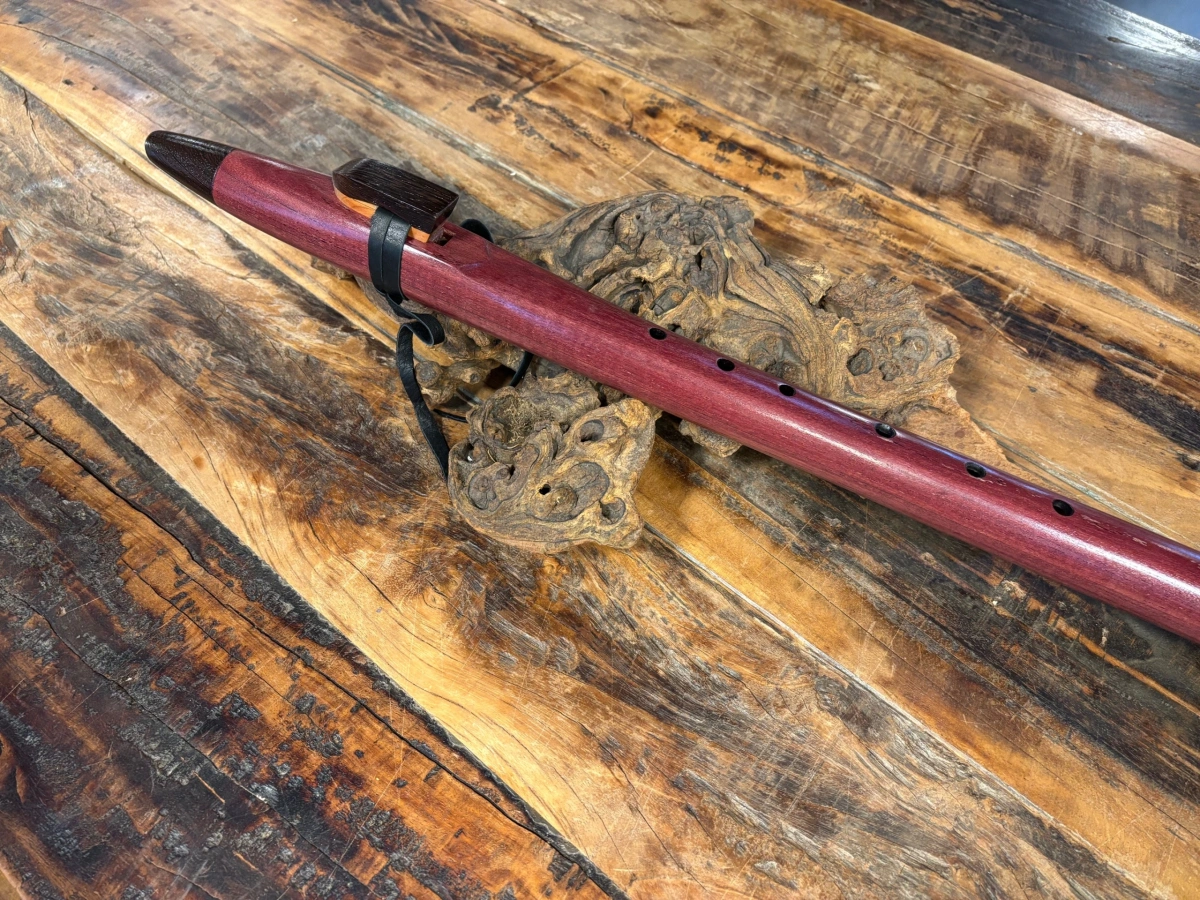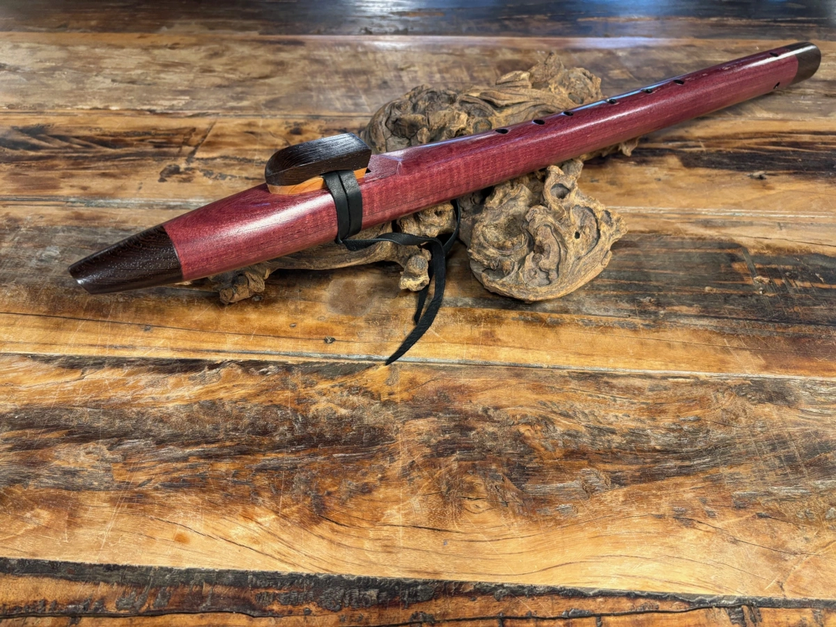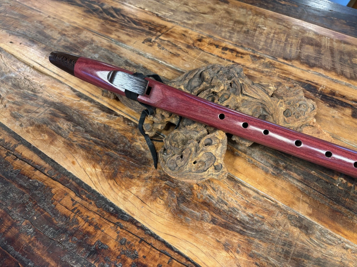 Entdecke die handgefertigte Gebetsflöte aus Purpleheart mit Wenge-Akzenten in E-Moll von Miguel Medina. 63,5 cm Länge, 25 mm innen. Klarer, warmer Bassklang!