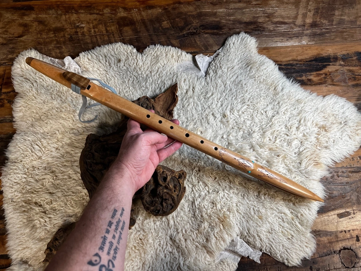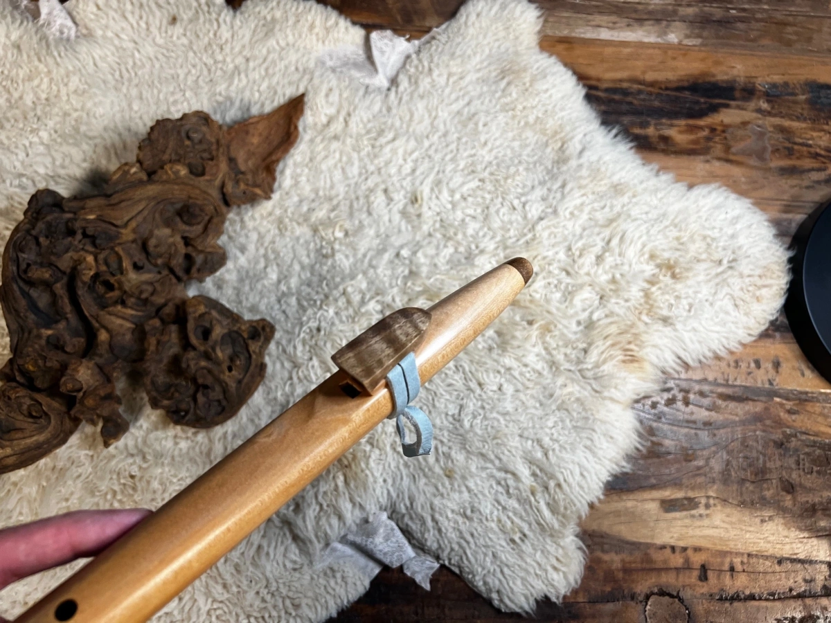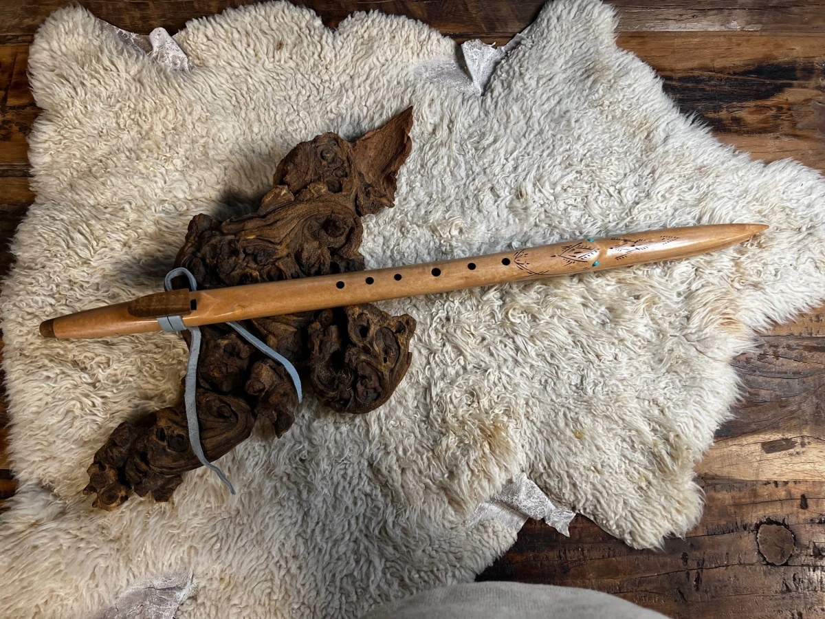 Traditionell mit einem Brennstab getunt, lädt die Flöte das Element Feuer ein und entfaltet die Energie der Inspiration, die jedem Ton innewohnt. So wird sie zu einem Klangwesen, das Erde und Luft, Körper und Geist, Mensch und Natur miteinander verbindet – jeder Ton ein Gebet, eine Brücke zwischen Himmel und Erde, Klang und Stille.
