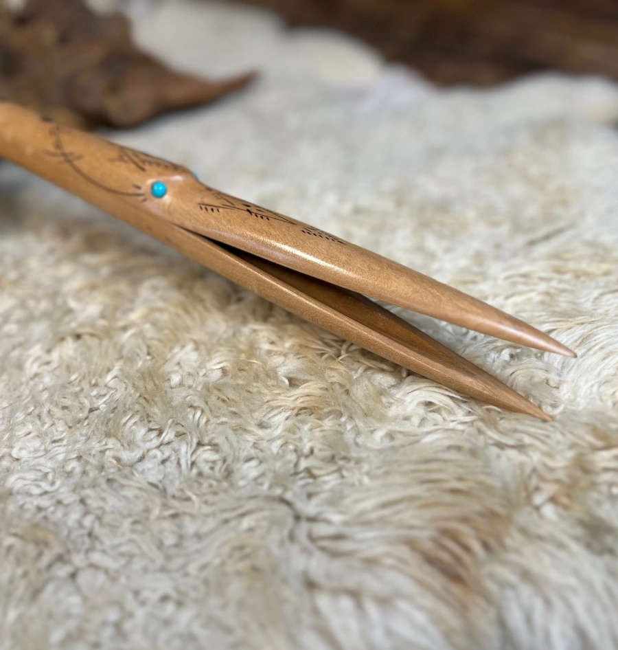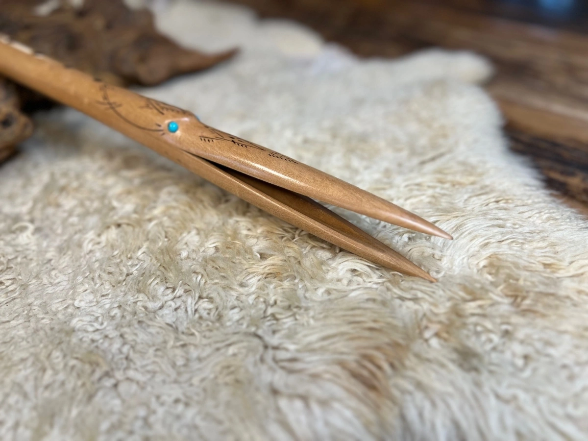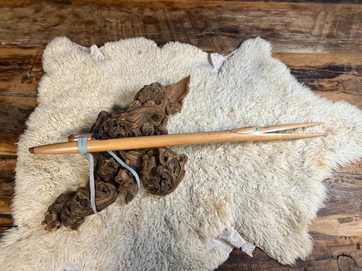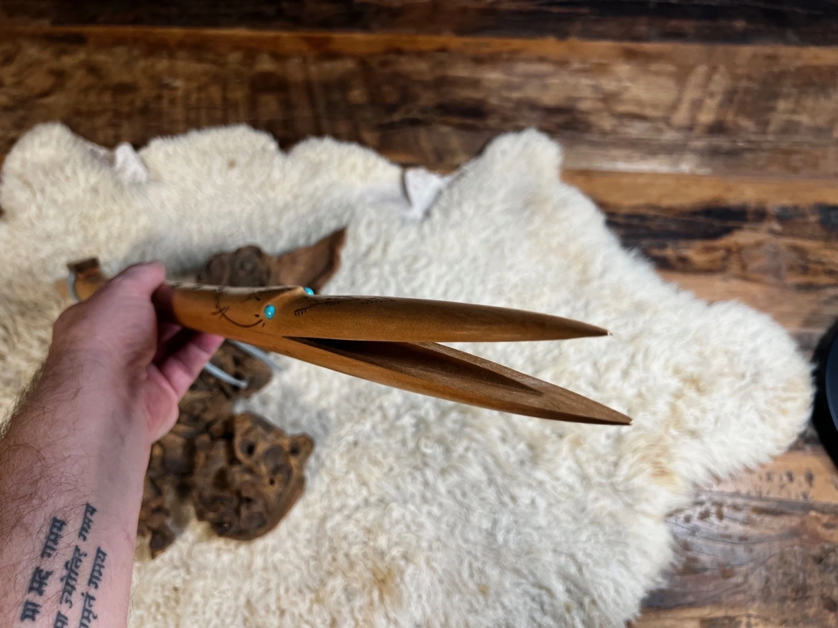 Das untere Ende ist zu einem Kranichkopf geschnitzt, dessen türkisfarbene Augen einen lebendigen, symbolstarken Akzent setzen. Dezente, eingebrannte Tribal-Verzierungen unterstreichen die Ästhetik und Tiefe – Türkis steht traditionell für Schutz, Klarheit und Verbindung.