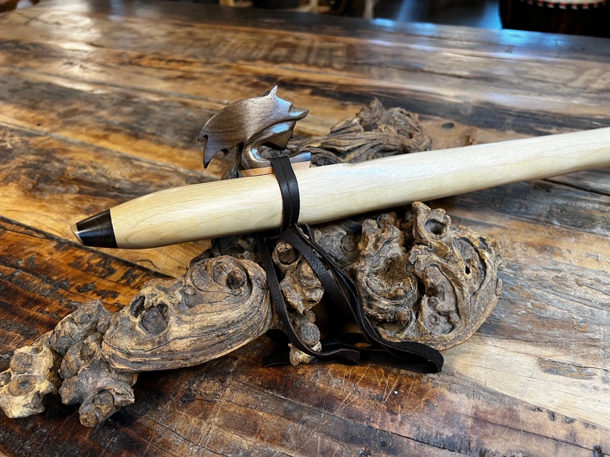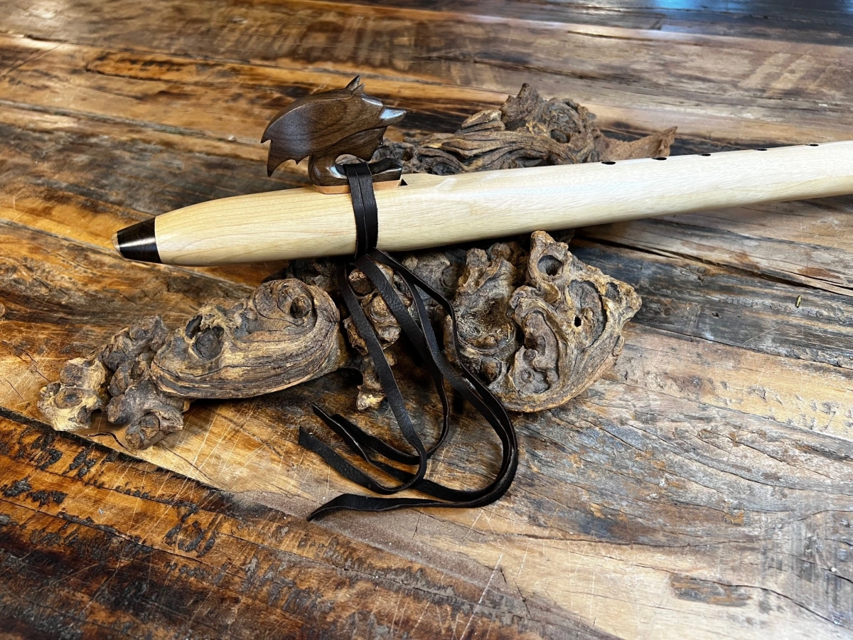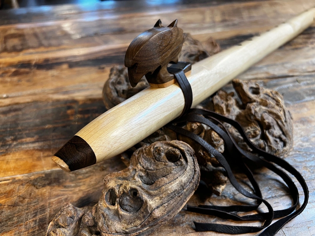 Kraftvolle Wolf-Chief Gebetsflöte aus Myrtle und Ziricote in E-Moll. Präzise gestimmt, warm im Klang und voller Seele – ein seltenes, signiertes Sammlerstück.