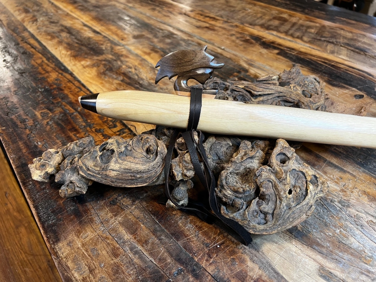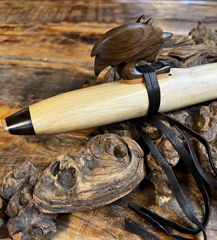 Der Windblock „Wolf Chief“ zeigt ein abstraktes Zusammenspiel aus Wolfskopf und Menschenhaupt – Sinnbild für Instinkt und Bewusstsein, innere Führung und gelebte Weisheit. Er verleiht der Flöte eine starke visuelle Aussage und unterstützt zugleich eine präzise, kontrollierte Ansprache.
