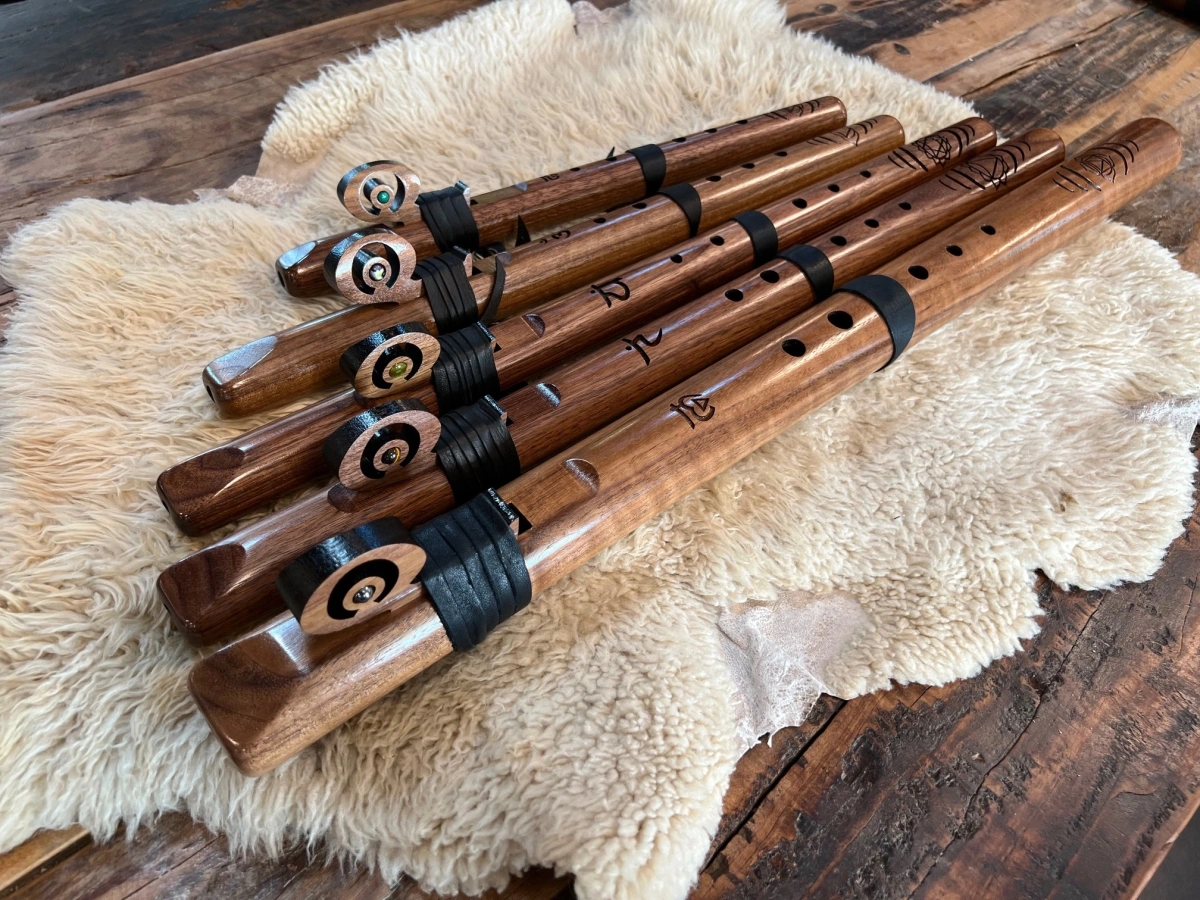 Jede Flöte wird in einer kleinen Werkstatt in den Bergen Süd-Arizonas aus einem einzigen Stück Walnussholz gefertigt. Die Härte und Dichte dieses Holzes verleihen dem Klang eine klare, kristallene Stimme – besonders in den hohen Tönen entfaltet sich ihre strahlende Präsenz.