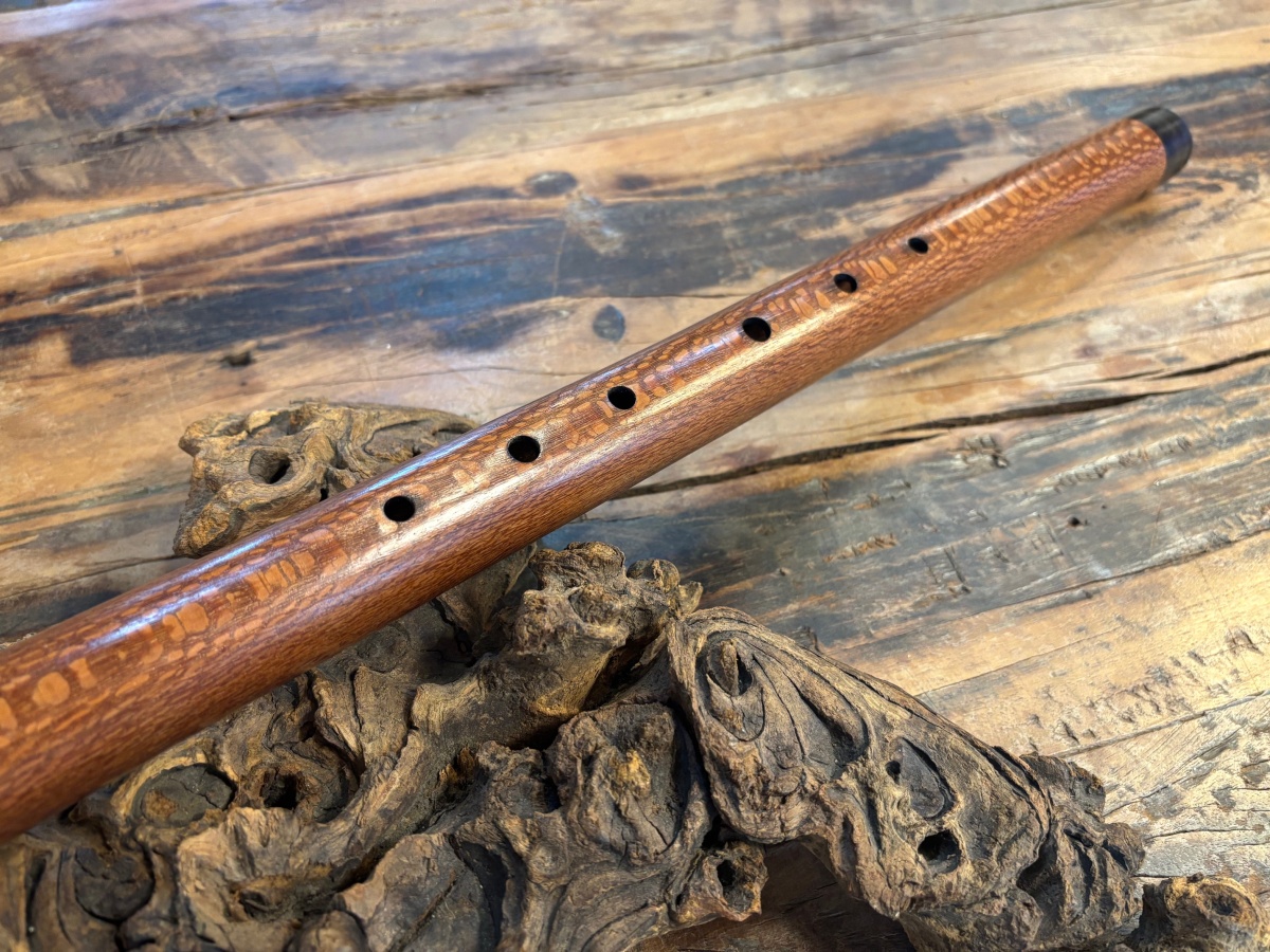Diese handgefertigte Gebetsflöte in tiefem D-Moll aus Lacewood vereint exotische Schönheit mit herausragender Klangqualität. Lacewood ist ein hartes, edles Tonholz mit feiner Maserung, das der Flöte einen klaren, warmen und meditativen Klang verleiht – präsent, lebendig und zugleich umarmend.