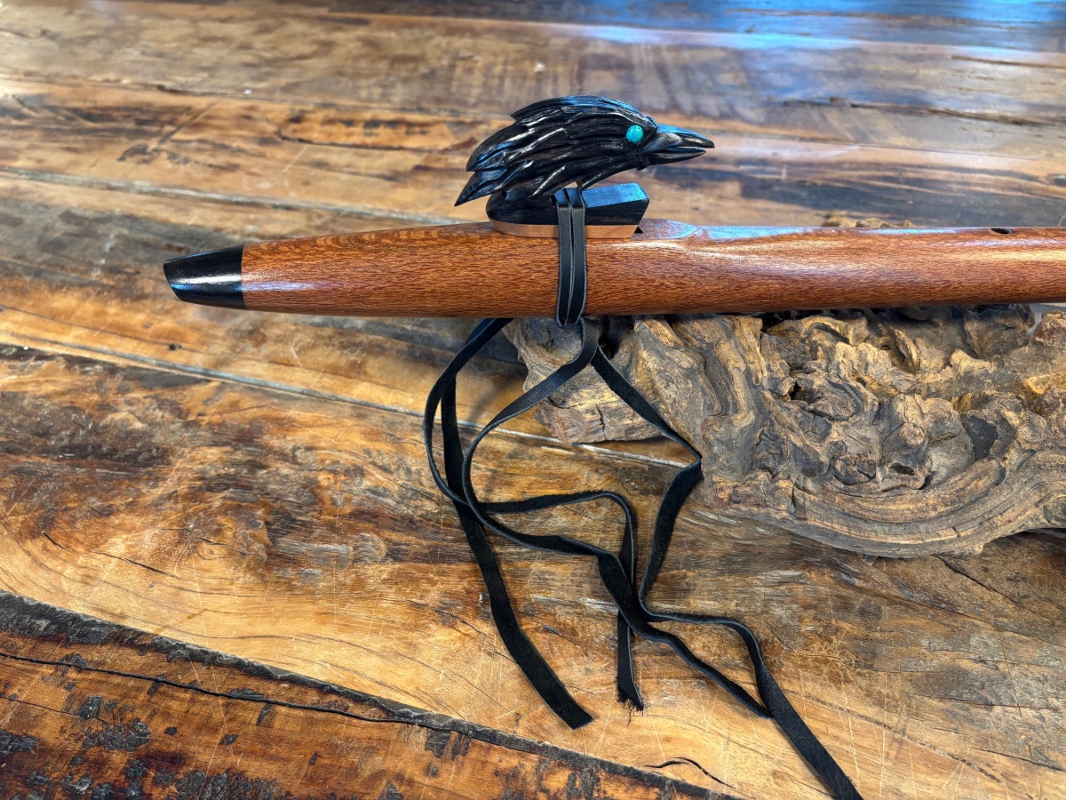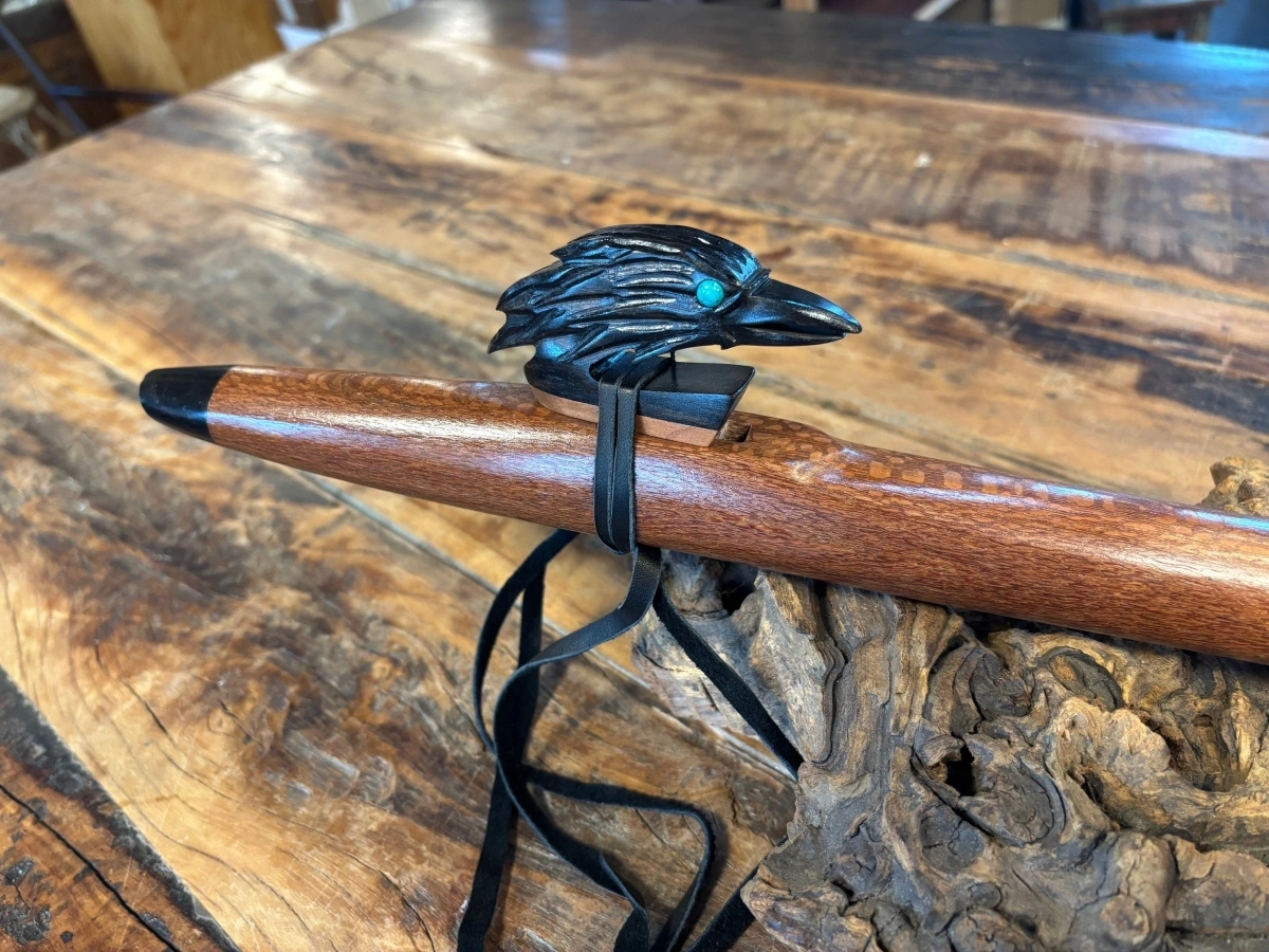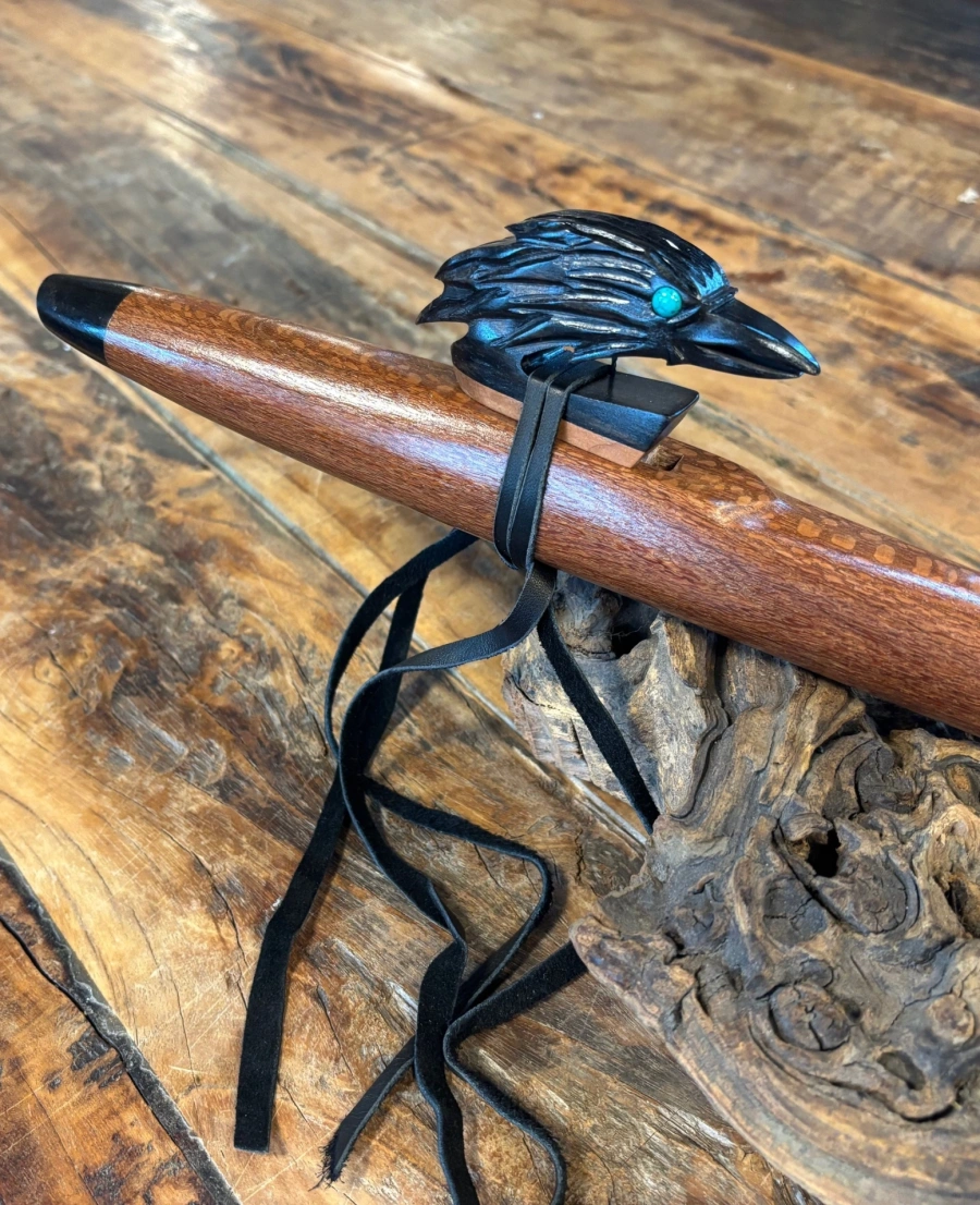 Die Endkappen und der kunstvoll gearbeitete Raven-Windblock aus Ebenholz setzen einen eleganten, kontrastreichen Akzent. Besonders auffällig sind die türkisen Augen des Raben, die dem Windblock Leben und Ausdruck verleihen und die Flöte zu einem visuellen Highlight machen.