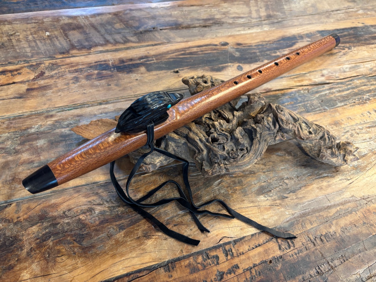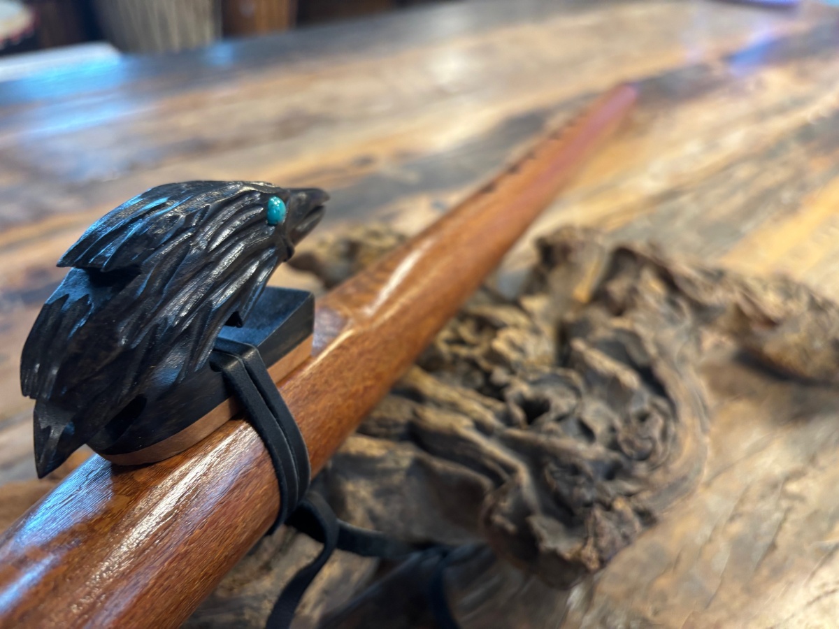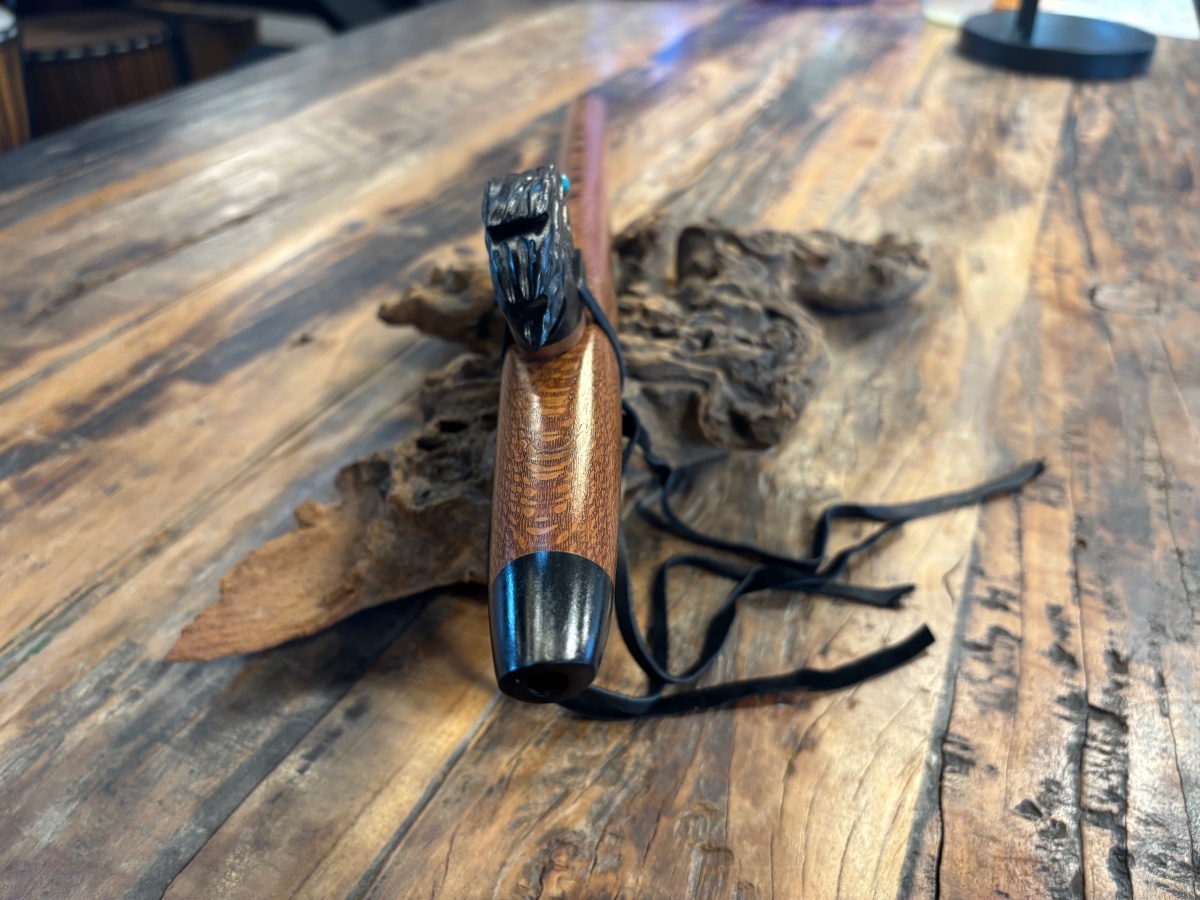 Die Endkappen und der kunstvoll gearbeitete Raven-Windblock aus Ebenholz setzen einen eleganten, kontrastreichen Akzent. Besonders auffällig sind die türkisen Augen des Raben, die dem Windblock Leben und Ausdruck verleihen und die Flöte zu einem visuellen Highlight machen.
