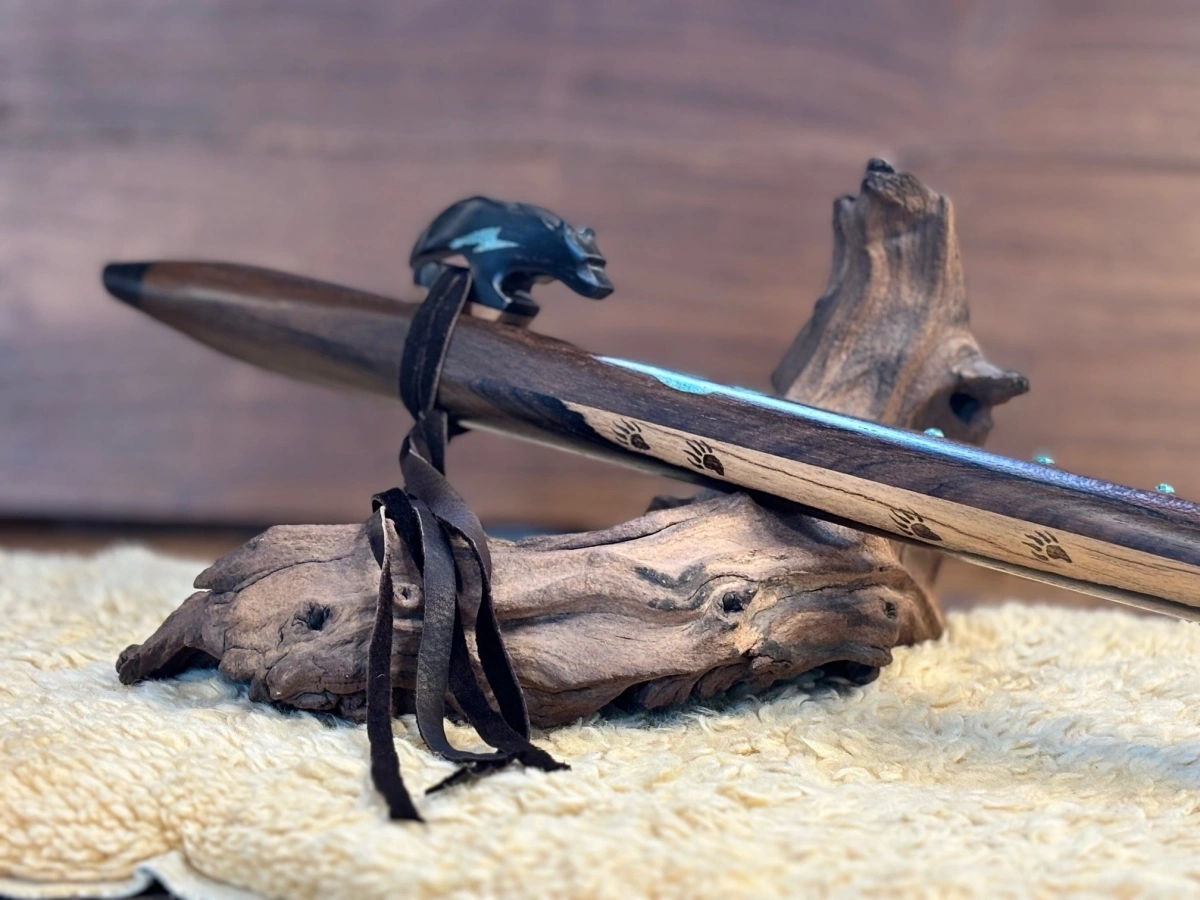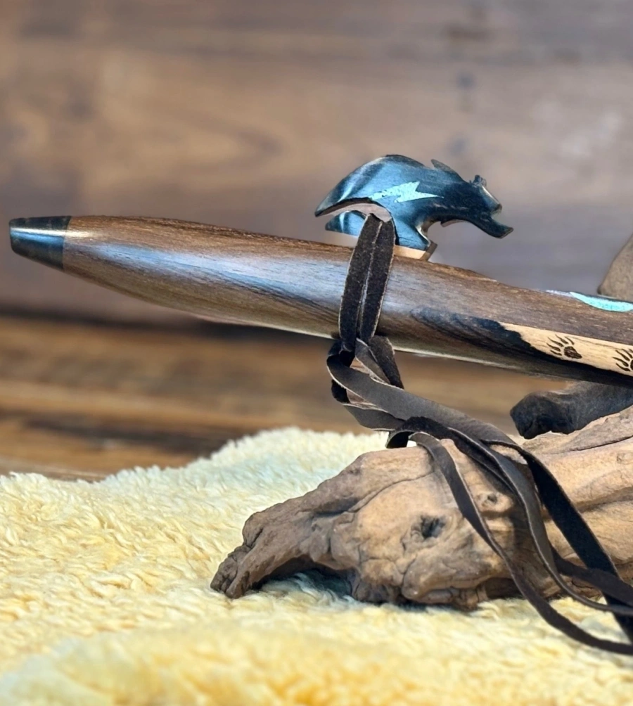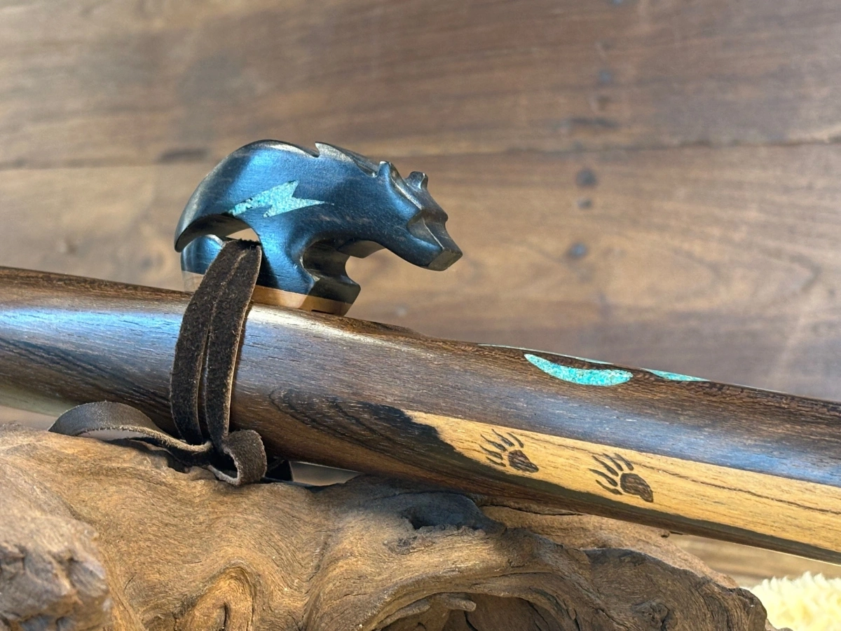 Der kunstvoll gearbeitete Bären-Windblock aus Ebenholz bildet einen bewussten Kontrast. Das schwere, dichte Holz unterstützt eine präzise Luftführung und klare Tonentwicklung. Der mit Türkis-Blitz-Einlagen verzierte Lightning Bear steht für Stärke, Schutz und klare Ausrichtung. Eingebrannte Bärentatzen und Türkis-Inlays im Flötenkörper vertiefen diese Symbolik. Eine helle natürliche Stelle im Rosenholz, die wie ein Lichtstrahl wirkt, greift die Energie des Lightning Bear auf und verstärkt die Ausrichtung auf Klarheit und Führung.