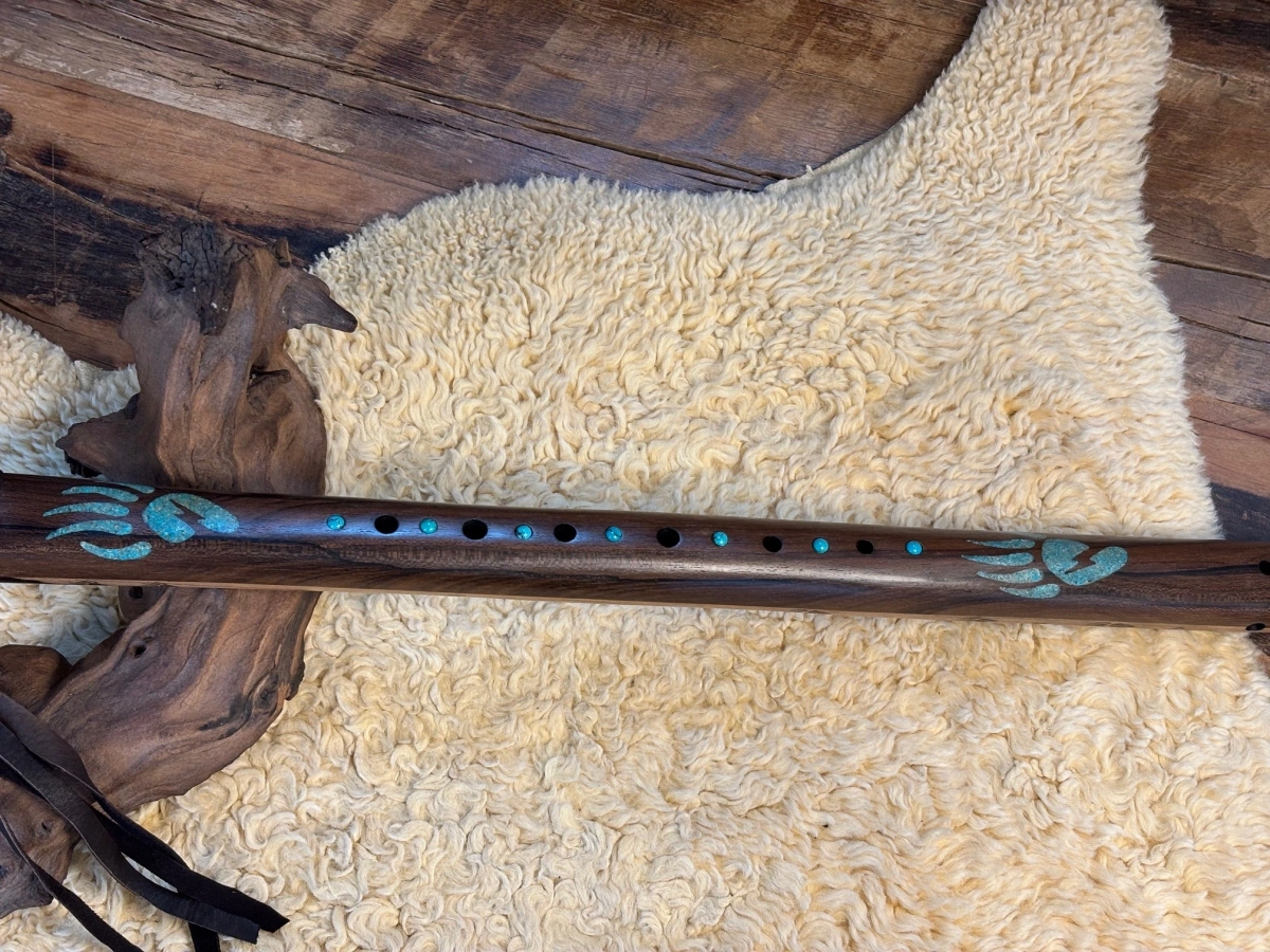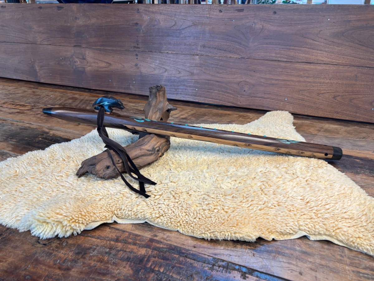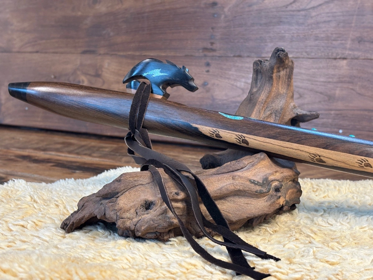 Der kunstvoll gearbeitete Bären-Windblock aus Ebenholz bildet einen bewussten Kontrast. Das schwere, dichte Holz unterstützt eine präzise Luftführung und klare Tonentwicklung. Der mit Türkis-Blitz-Einlagen verzierte Lightning Bear steht für Stärke, Schutz und klare Ausrichtung. Eingebrannte Bärentatzen und Türkis-Inlays im Flötenkörper vertiefen diese Symbolik. Eine helle natürliche Stelle im Rosenholz, die wie ein Lichtstrahl wirkt, greift die Energie des Lightning Bear auf und verstärkt die Ausrichtung auf Klarheit und Führung.