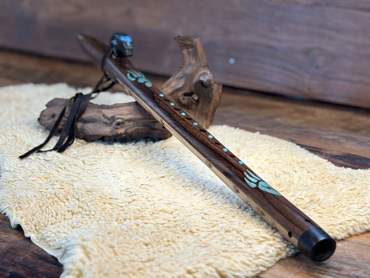 Diese handgefertigte Lightning Bear Flute in D-Moll aus edlem Rosenholz vereint Tiefe, Wärme und Präsenz. Die dichte Struktur des Rosenholzes sorgt für eine ruhige Ansprache, stabile Tonführung und einen vollen, erdigen Klang mit tragender Bassqualität.