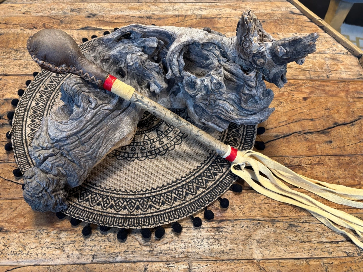 Dieses handgefertigte Werkzeug ist mehr als eine Rassel. Sie begleitet Dich auf Ritualen, schamanischen Reisen und in der spirituellen Praxis. Jedes Stück ist ein Unikat und trägt seine eigene Geschichte von Natur, Kraft und energetischer Reinigung.
