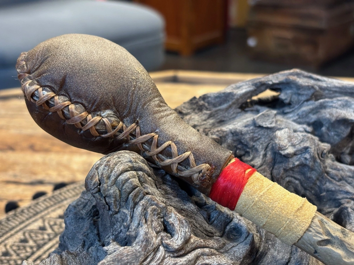 Diese Rohhautrassel aus harter, Bisonhaut trägt die Klarheit und Kraft der Natur in sich. Ihre natürliche Farbe erinnert an weite Ebenen und offene Himmel, während die robuste Struktur der Haut für einen klaren, warmen Klang beim Schütteln sorgt.
