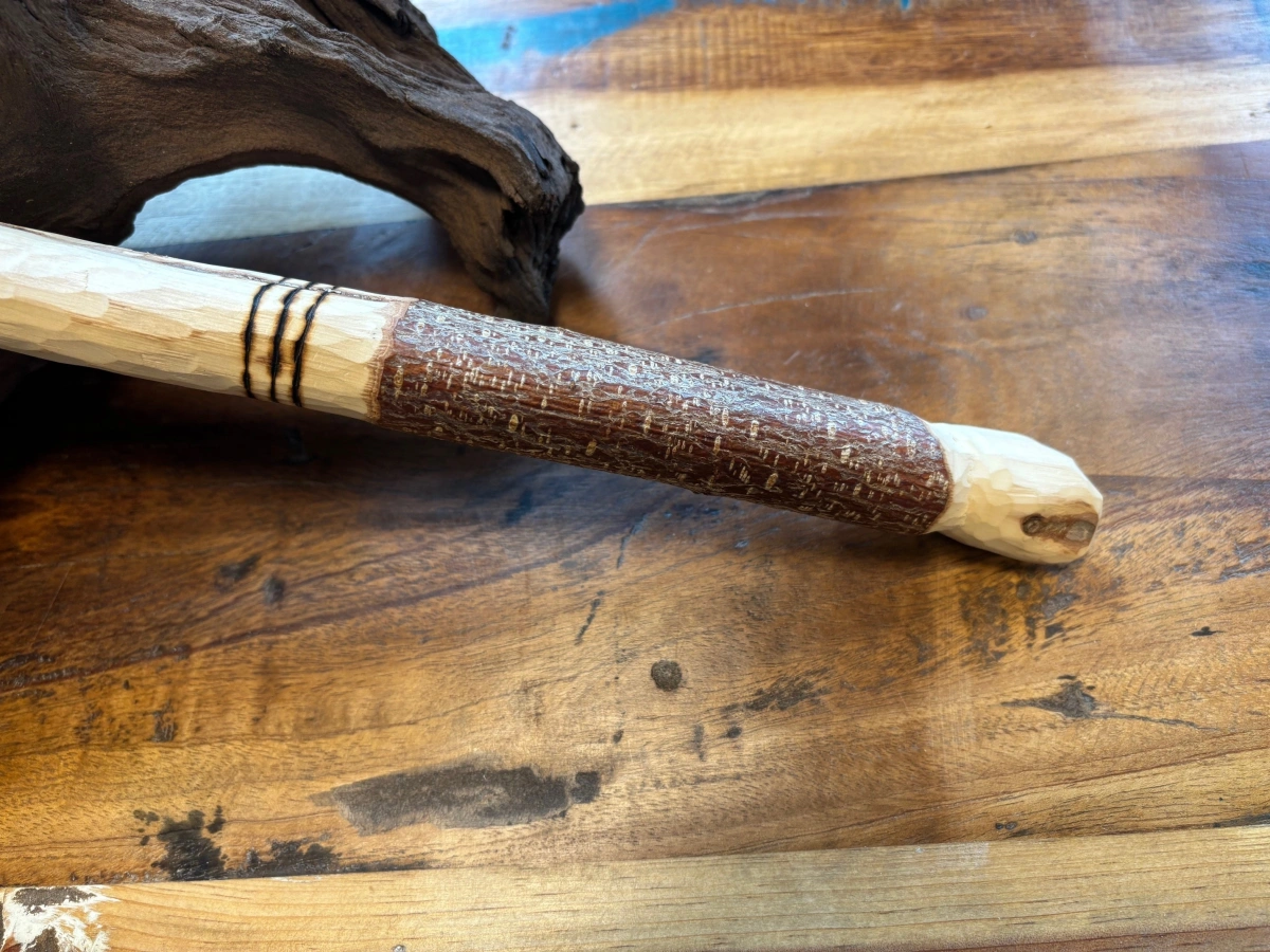 Der Haselnussholz-Stab ist von Hand mit Brandmustern verziert und macht jede Rassel zu einem Unikat.