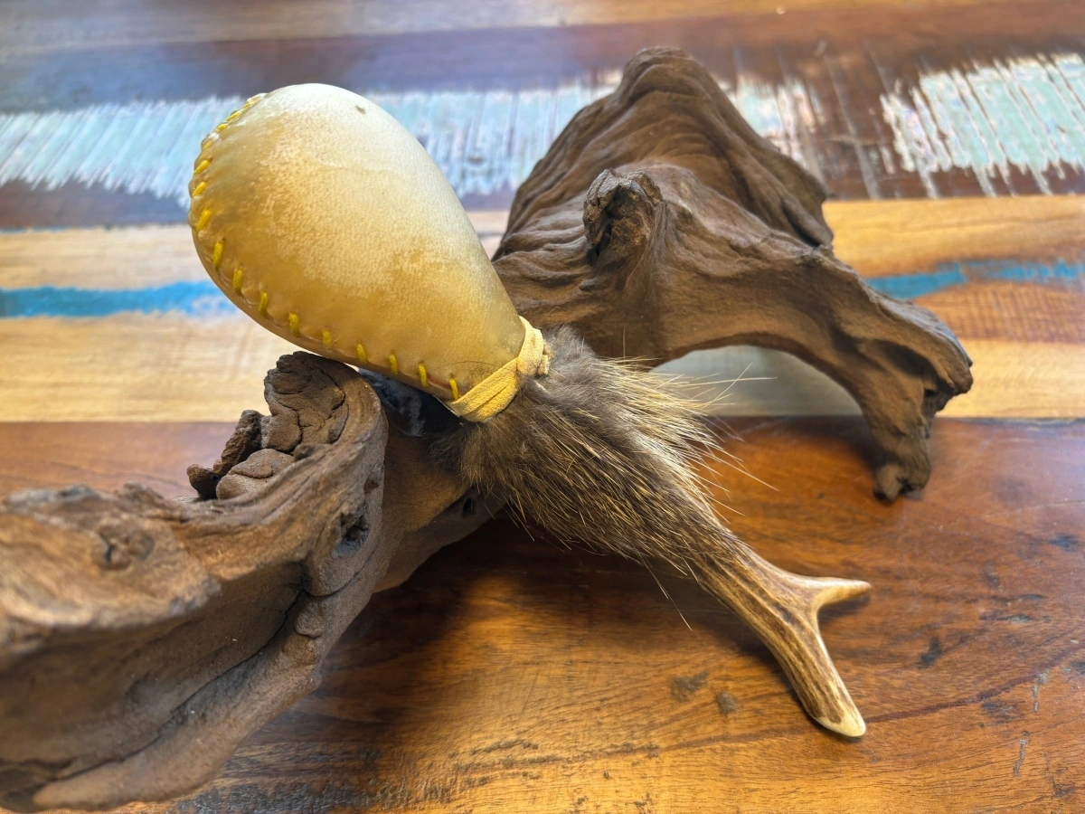 Der Kopf aus natürlicher Tierhaut erzeugt einen tiefen, klaren und erdverbundenen Klang. Der Schaft aus einer schönen Geweihspitze von Reh oder Hirsch sorgt für Stabilität und liegt angenehm in Deiner Hand – gut ausbalanciert für sanftes wie kraftvolles Spiel. Der Übergang zwischen Kopf und Schaft ist mit Fell verziert, ein Detail, das Wildheit und Feinheit harmonisch vereint.