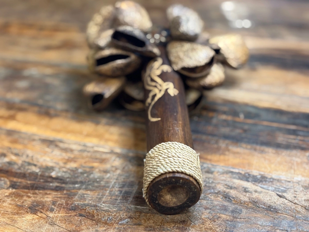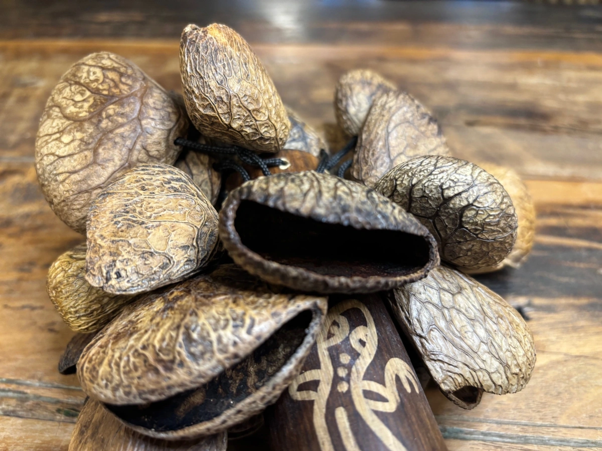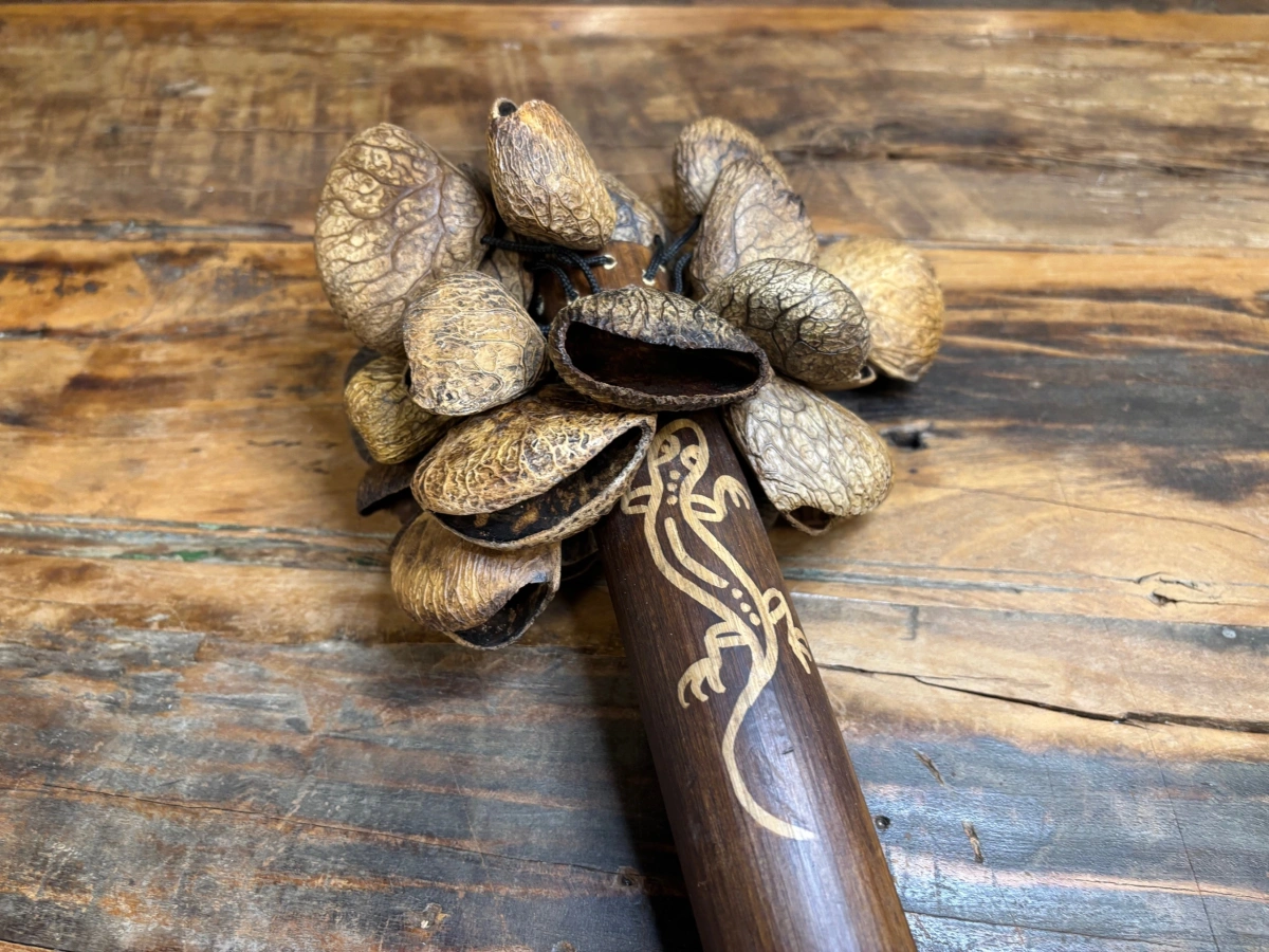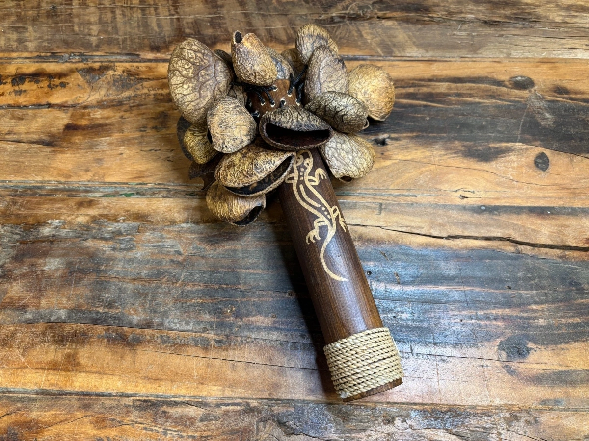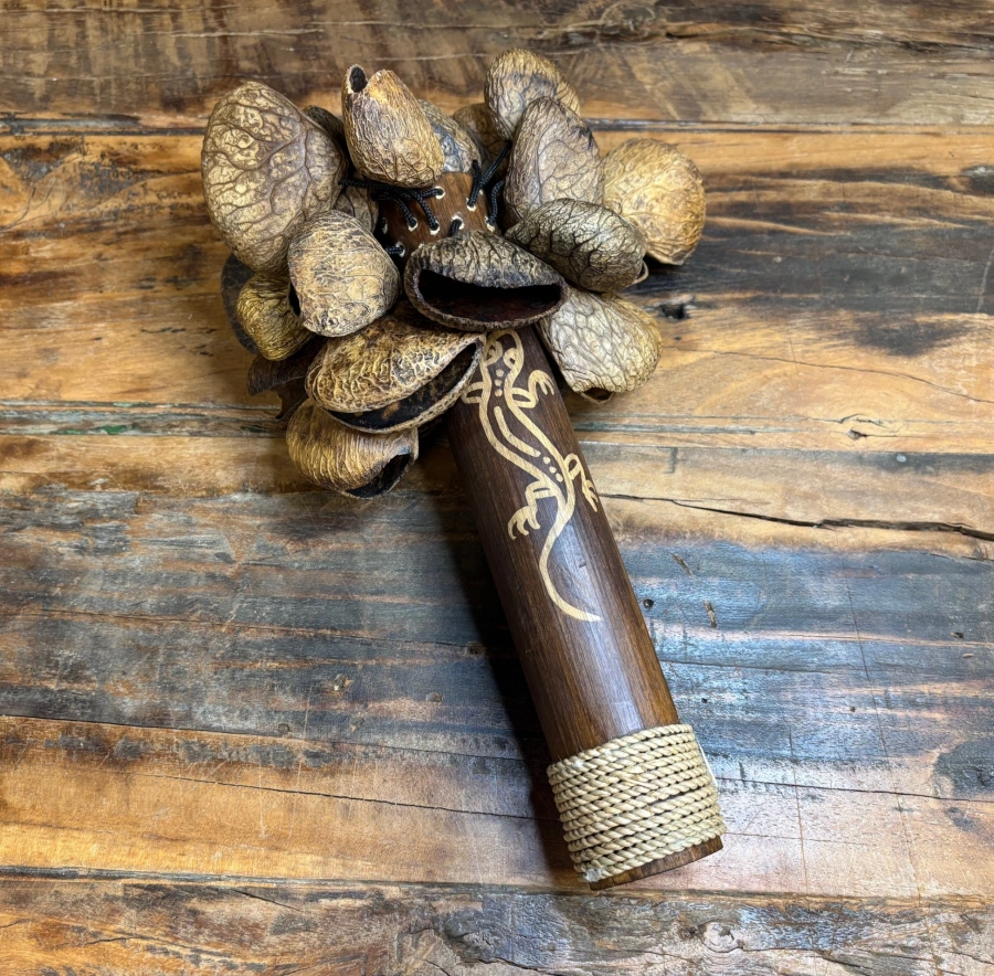 Diese Rassel erzählt von Wärme, Erde und Rhythmus. Pangi Samen sind aussen an den Bambus Stab angebunden und folgen jeder Bewegung mit ihrem eigenen, lebendigen Klang. Wie kleine Hüter des Rhythmus tanzen sie am Holz und erzeugen ein sanftes, erdiges Rascheln, das zugleich klar und beruhigend wirkt.