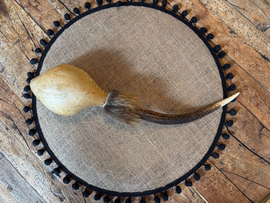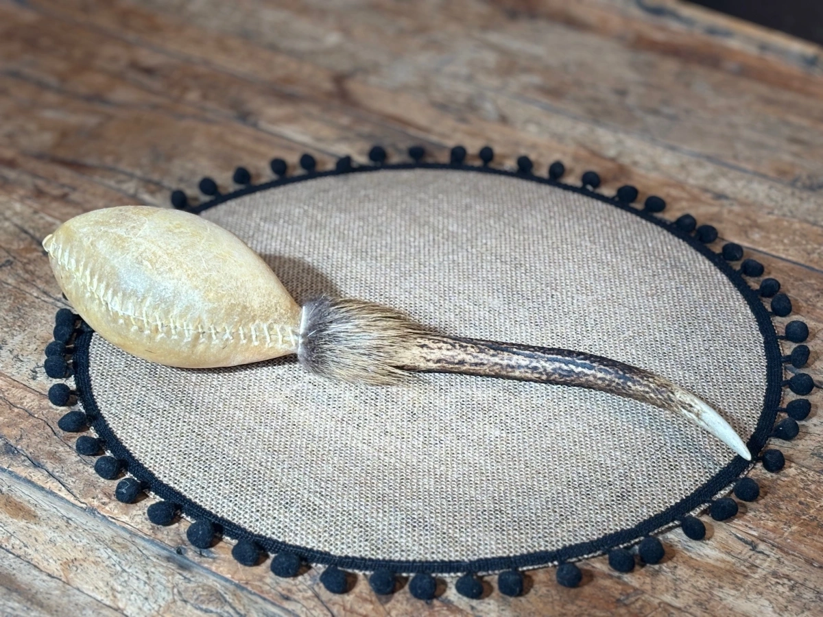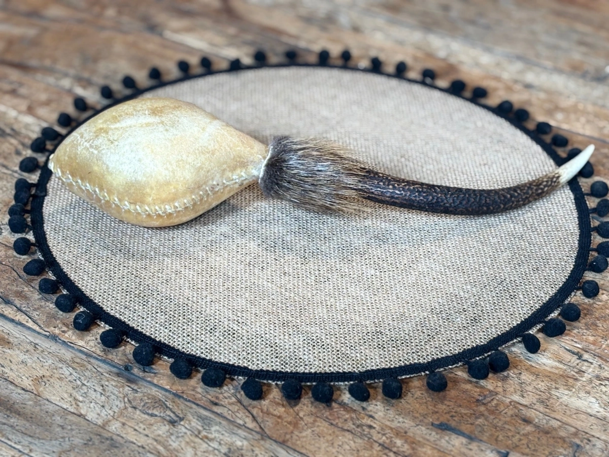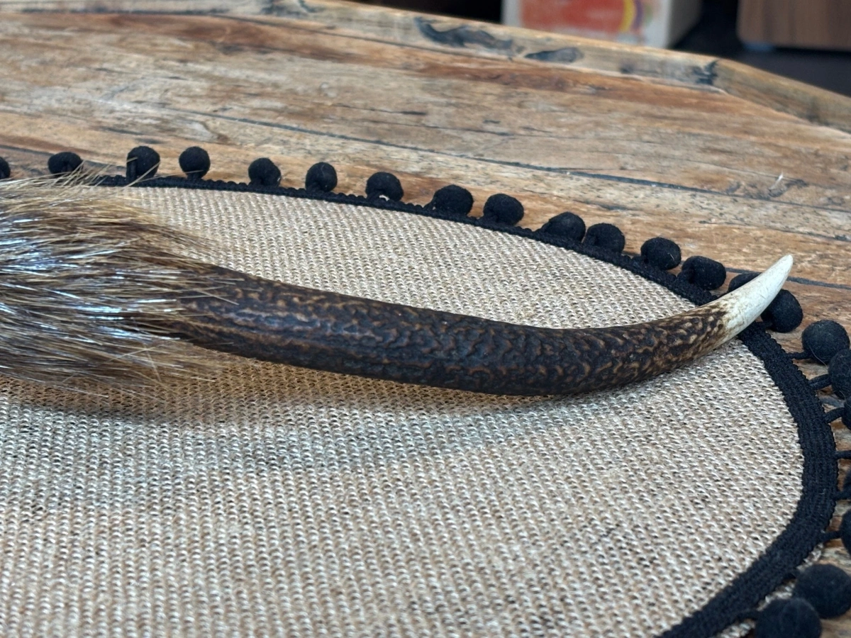 Der Griff aus Hirschhorn bringt die Qualität von Erdung, Stärke und natürlicher Würde in Dein Wirken. Die Rinderhaut trägt die ursprüngliche Kraft des Tieres – gemeinsam entsteht ein Instrument, das Dich achtsam führt und Deine Intention in Schwingung versetzt.