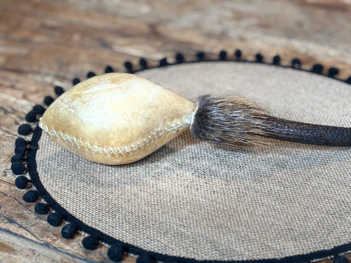 Diese schamanische Rassel trägt die uralte Stimme der Erde in sich. Gefertigt aus naturbelassener Rinderhaut und ergänzt durch einen kraftvollen Griff aus Hirschhorn, verbindet sie Dich mit den Rhythmen der Natur und den Ebenen jenseits des Sichtbaren.