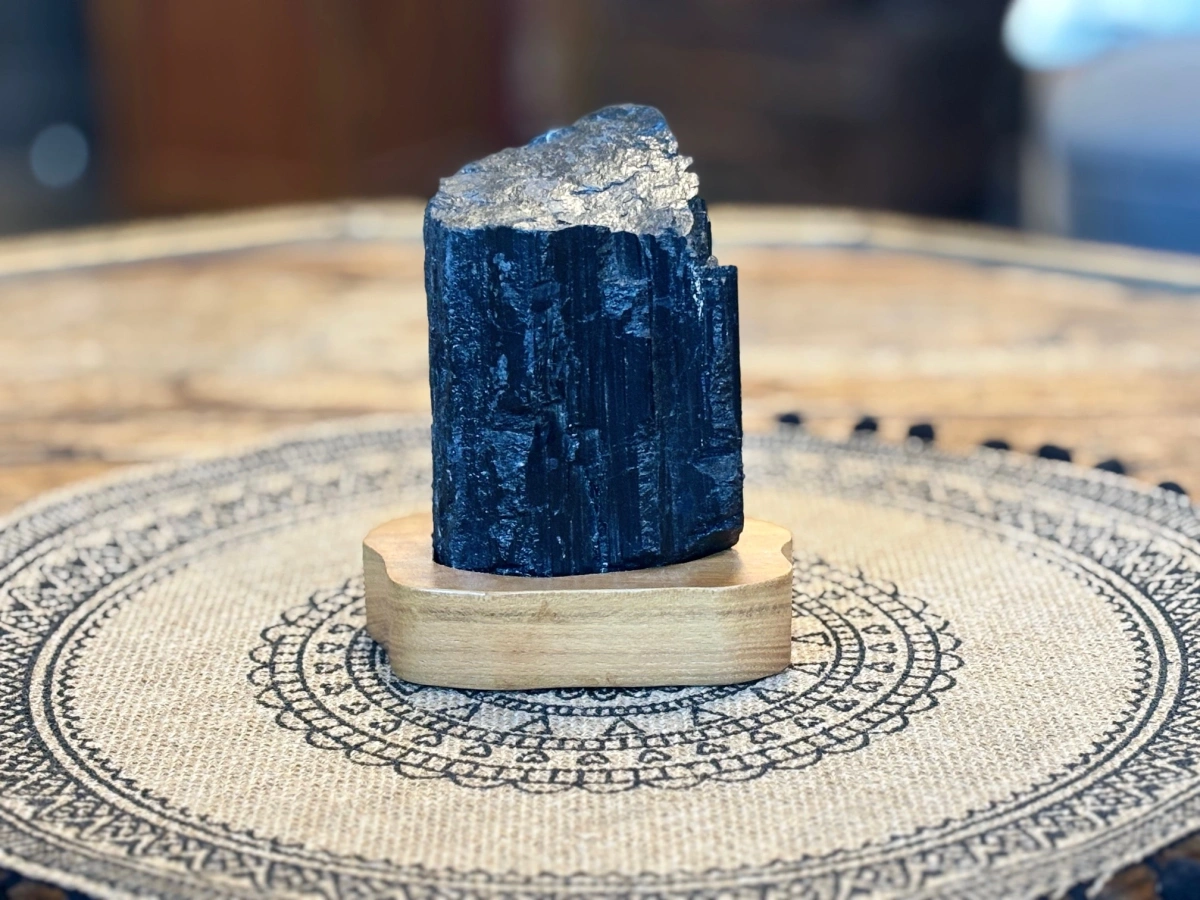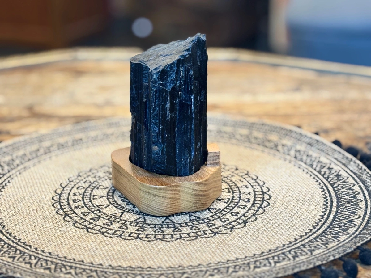 Schwarzer Turmalin auf Holzsockel | Kraftvoller Schutz & Erdung