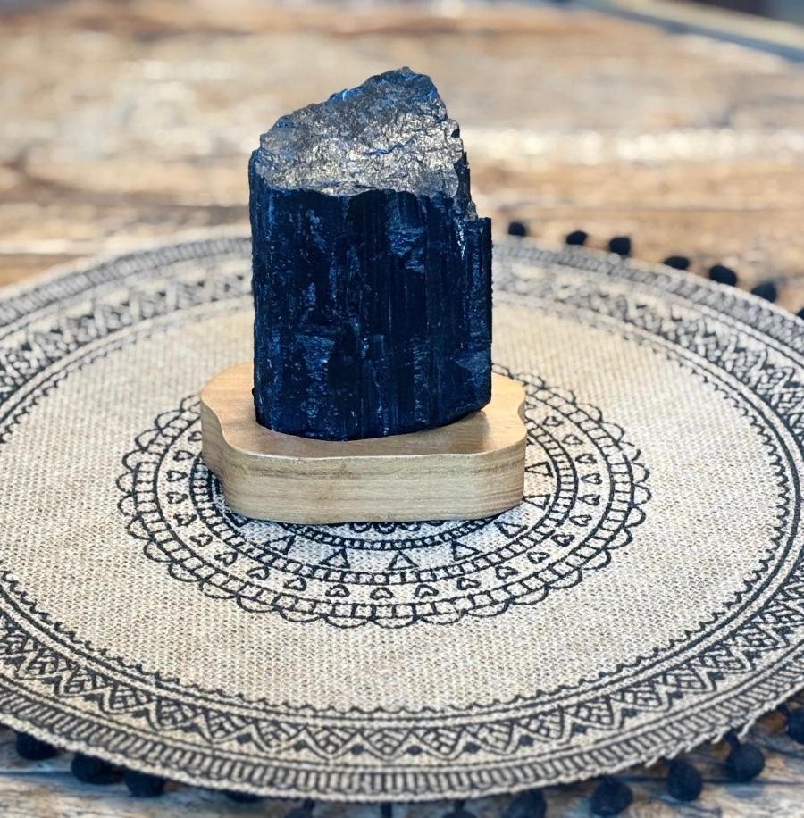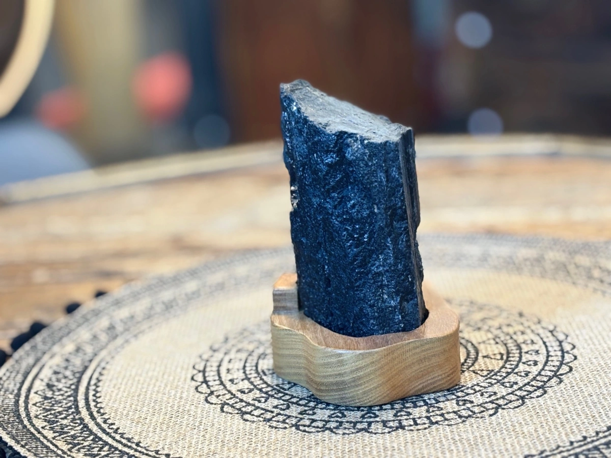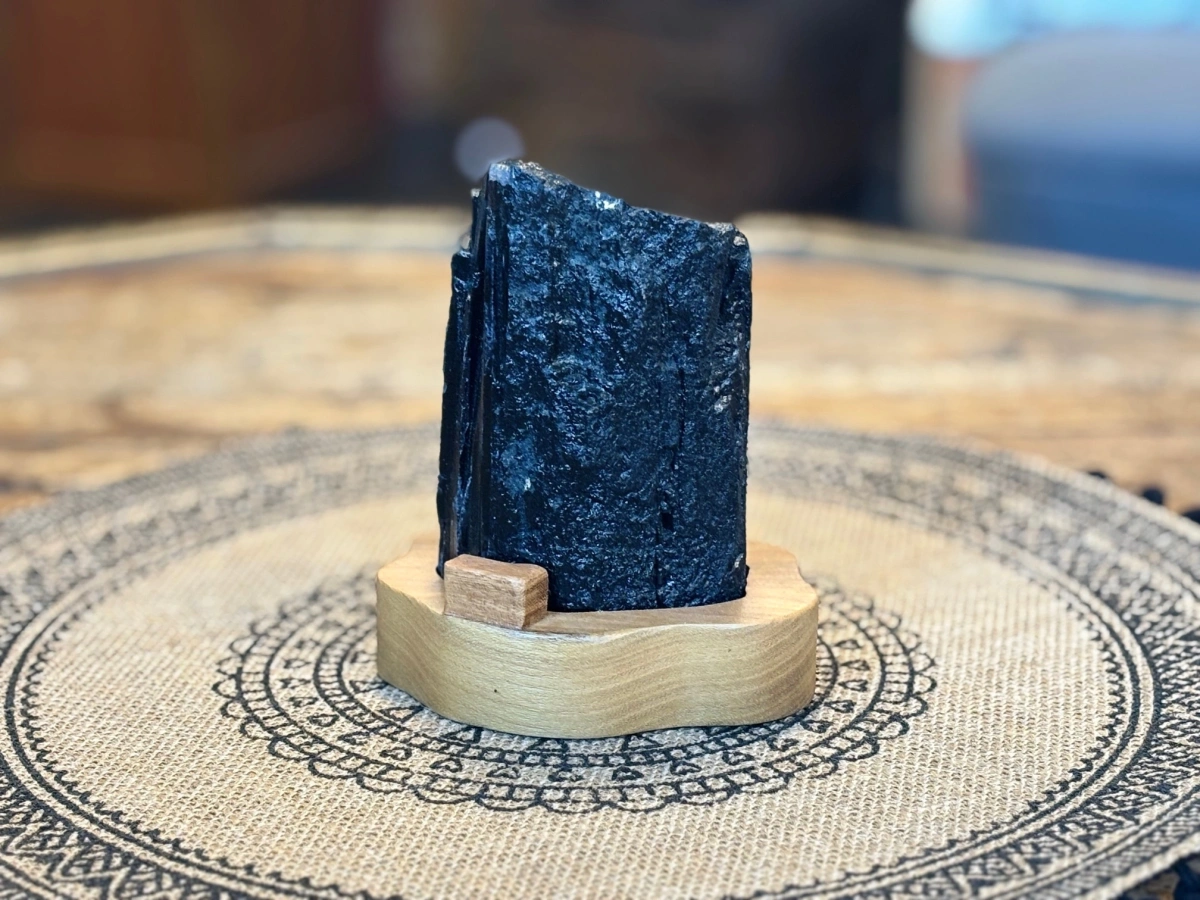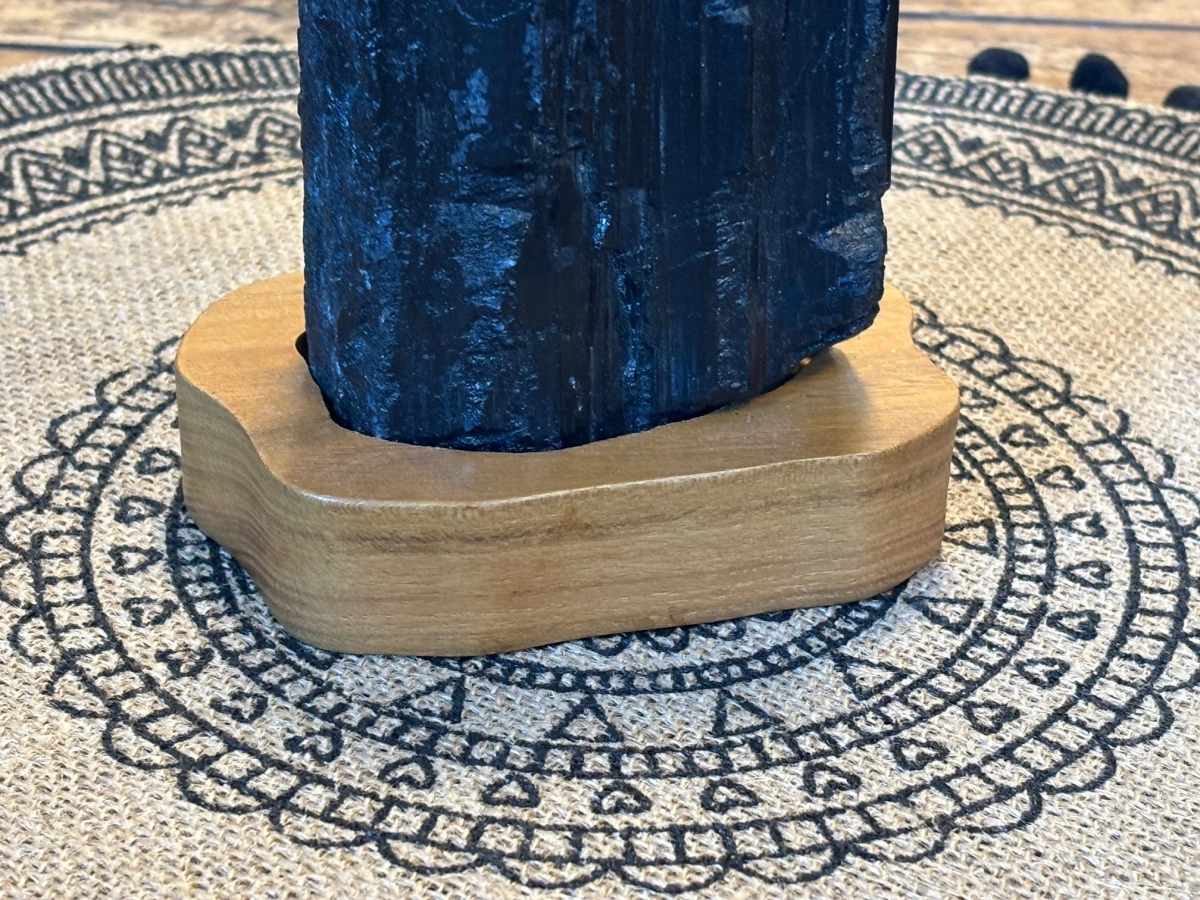 Schwarzer Turmalin auf Holzsockel | Schutz & Erdung