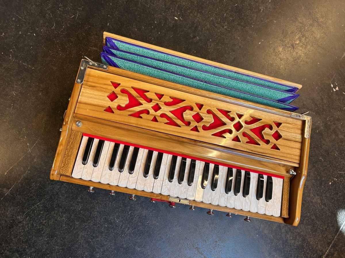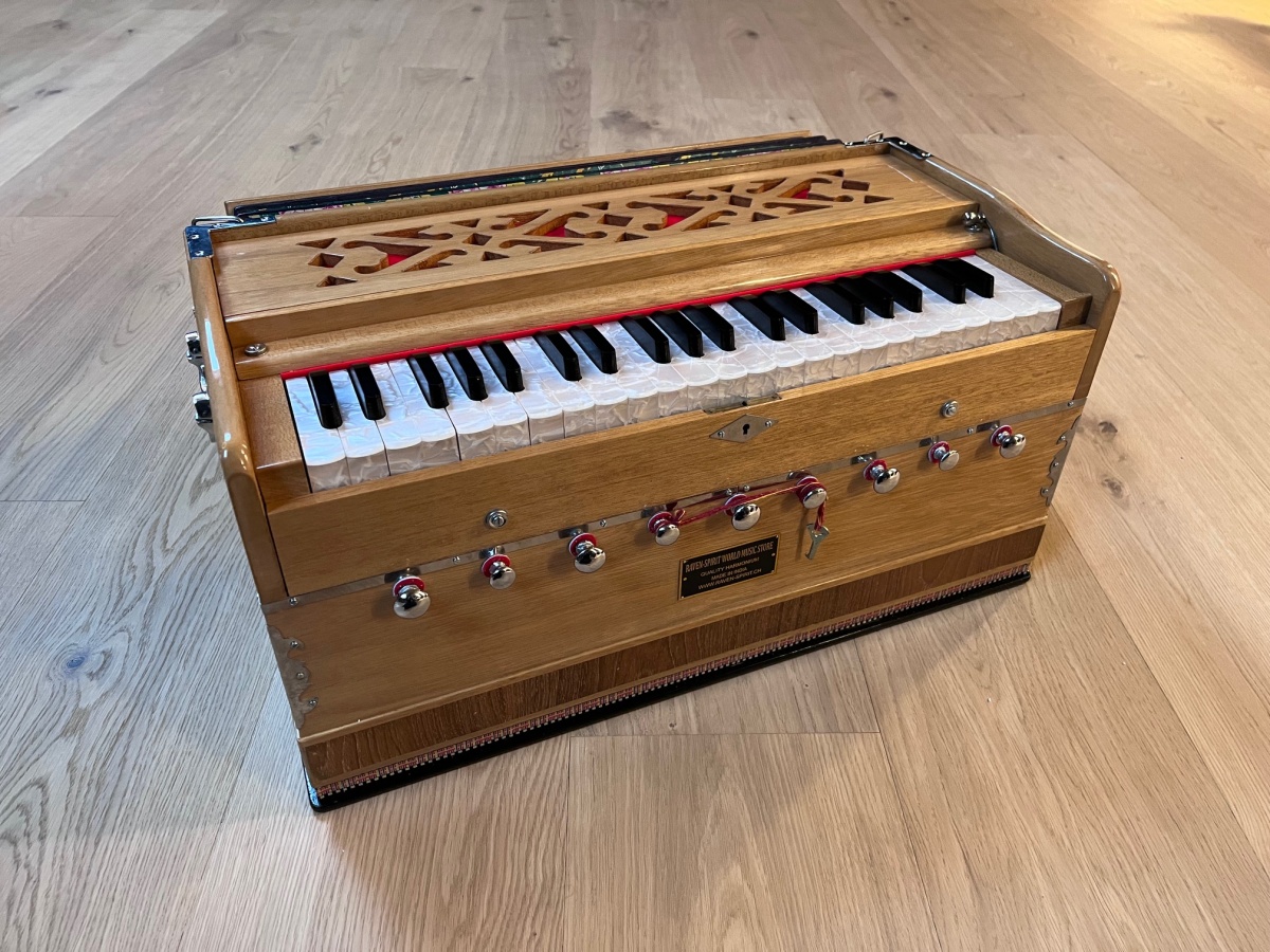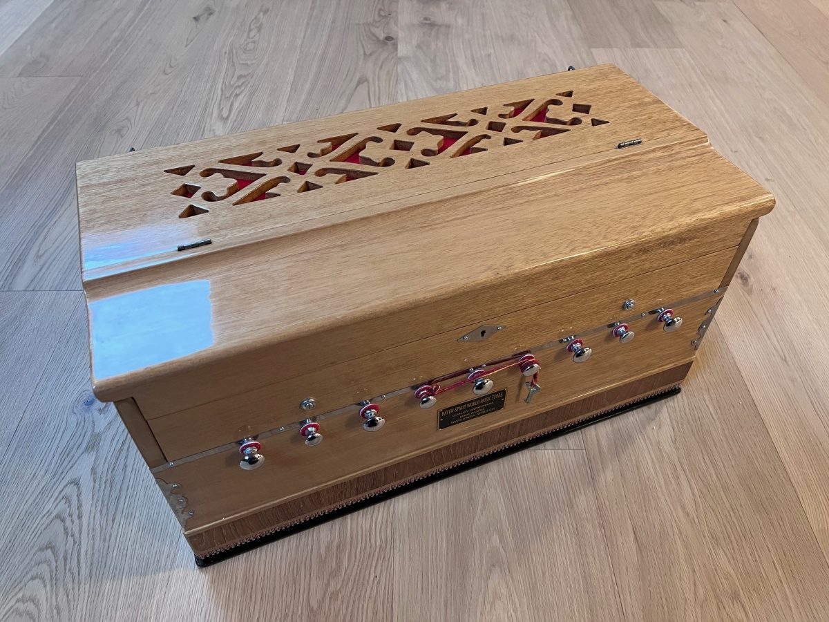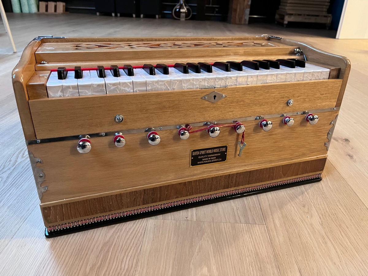 Dieses edel verarbeitete Harmonium von Monoj Kumar aus Kalkutta hat eine Klangbreite von 3½ Oktaven und eine sehr schöne Klangfarbe. Jeder Ton ist mit je einer Zunge in mittlerem und tieferem Register ausgestattet, sodass sich ein voller, tragender Klang ergibt. Mit Hilfe der Registerzüge, die grossen Knöpfe, lassen sich die beiden Register auch einzeln spielen.