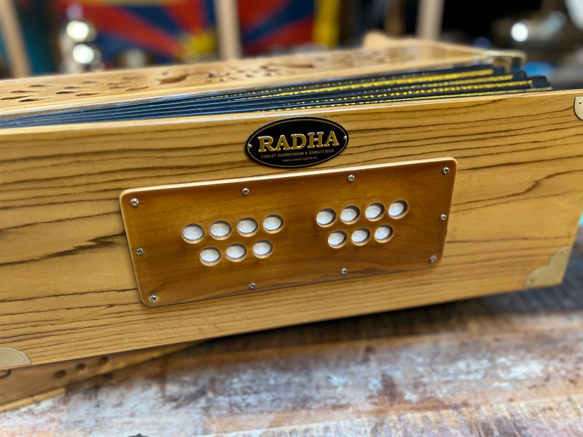 Das Radha Kirtan Harmonium wird aus feinstem Zedernholz gefertigt. Sein Klang ist warm und sanft, lässt sich sowohl sehr leise als auch kräftig spielen.