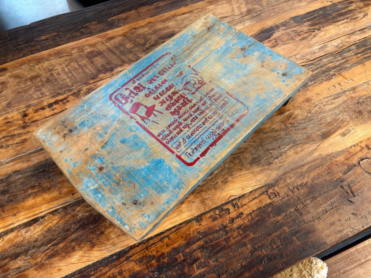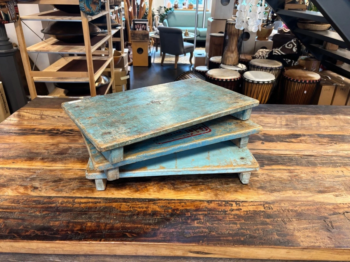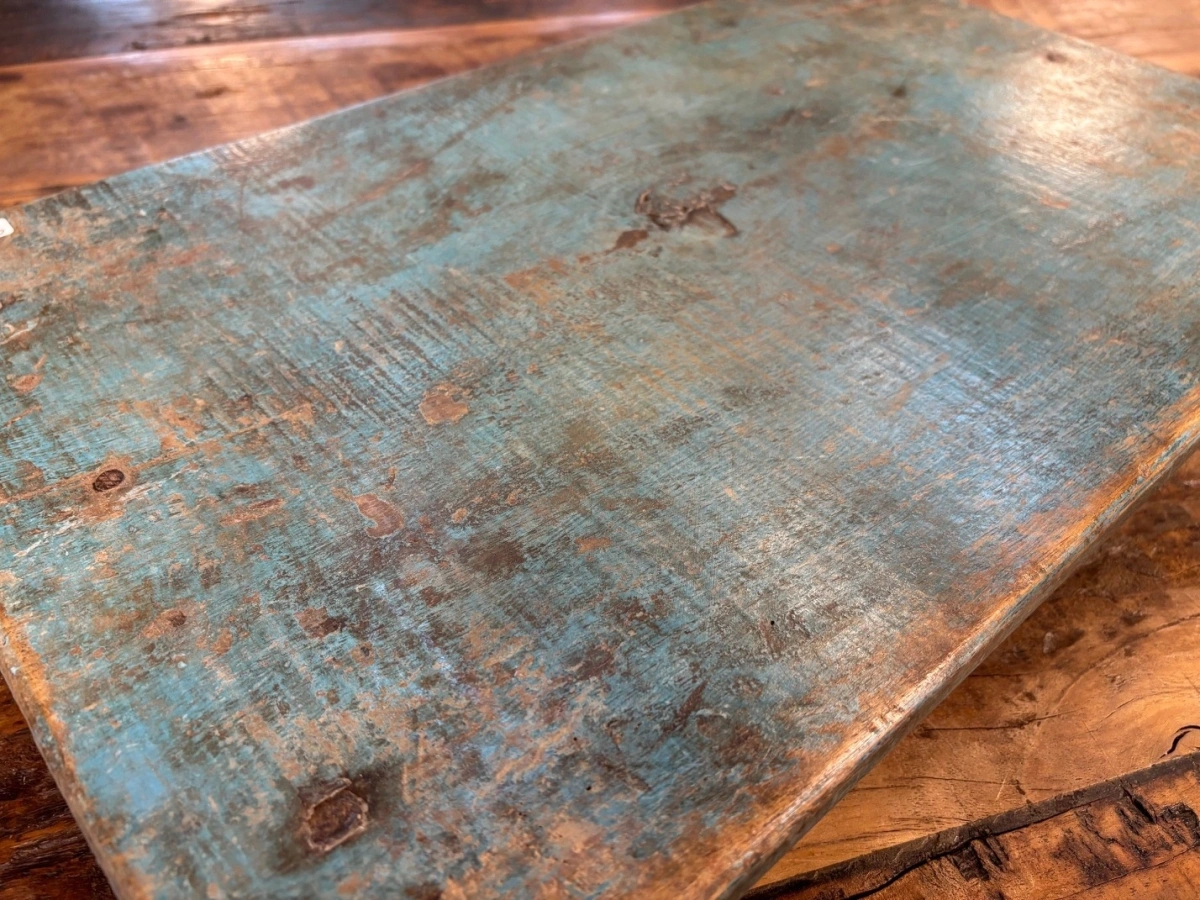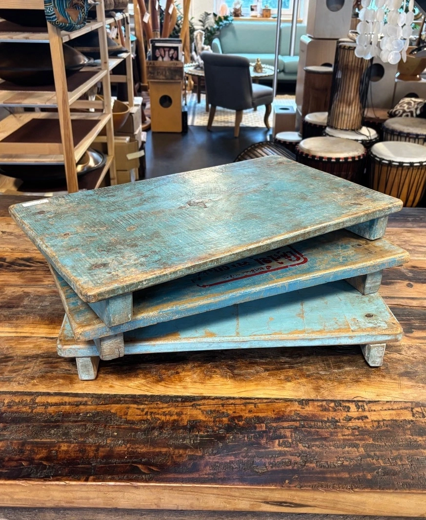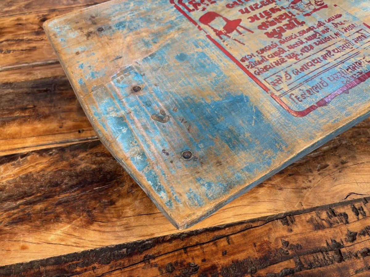 Gefertigt aus indischem Recyclingholz – etwa Teak, Mango oder Palisander – stammen die Tablare aus alten Abbruchhäusern. Jedes Stück trägt sichtbare Spuren seines früheren Lebens: mal mehr oder weniger türkise Farbe, teils mit roten Beschriftungen, die den individuellen Charakter betonen.