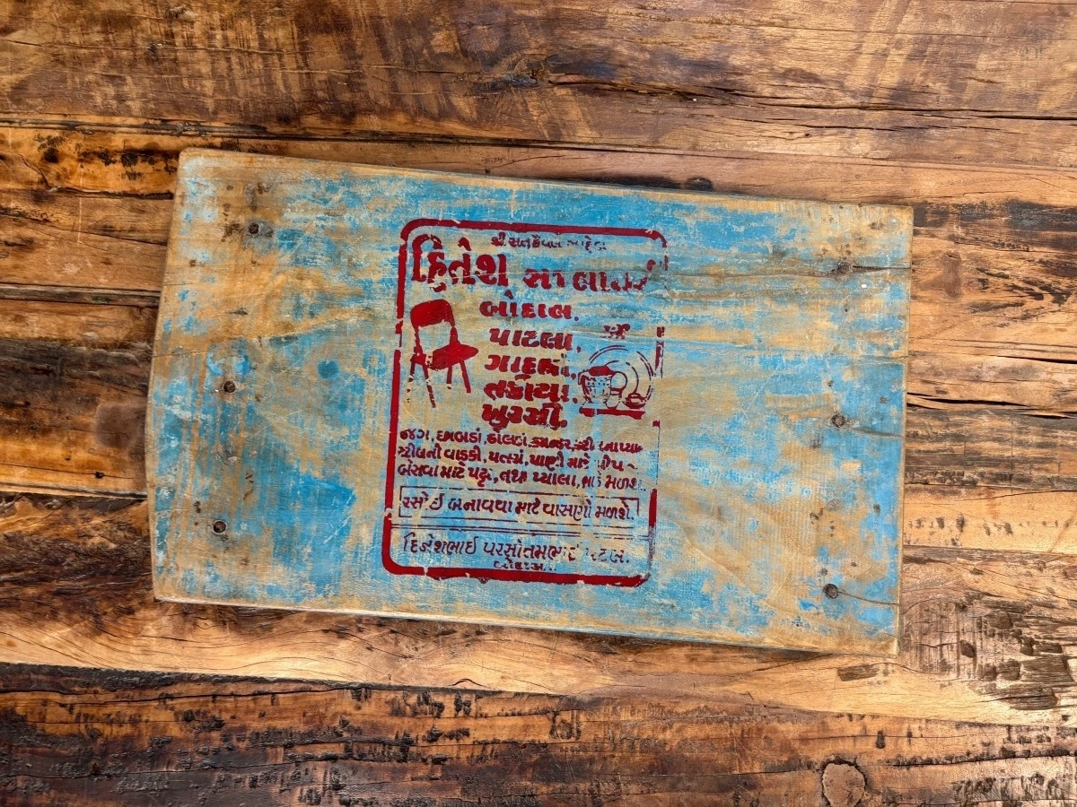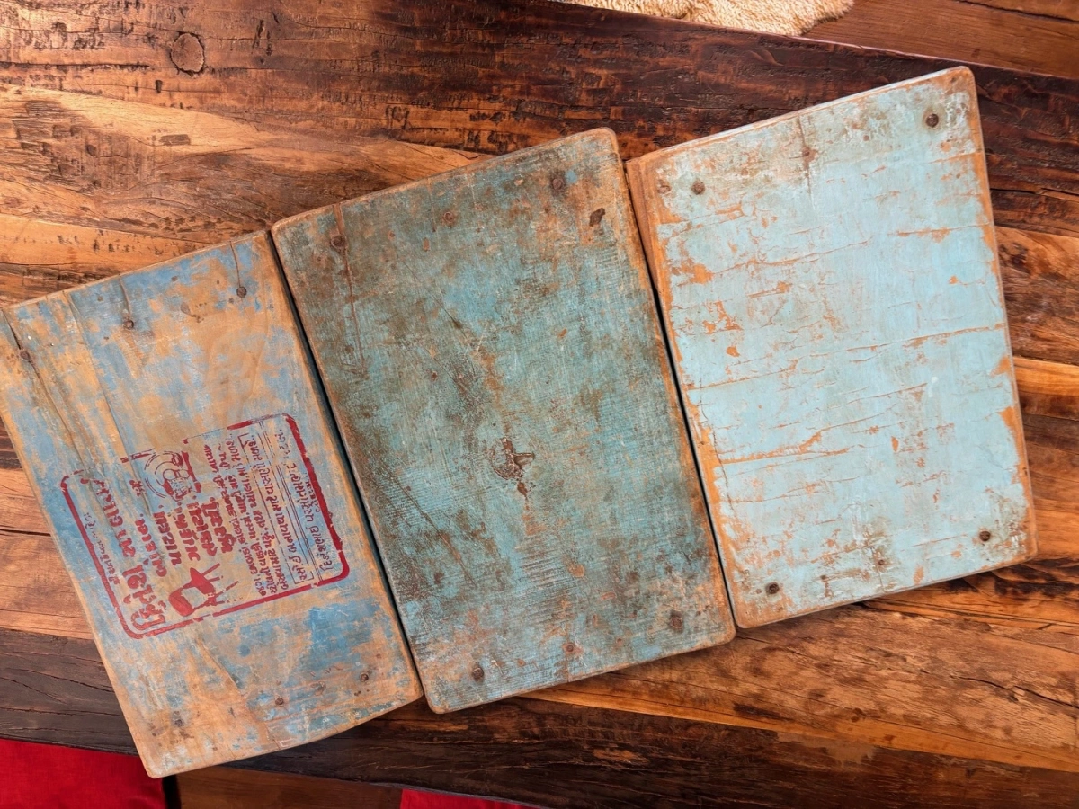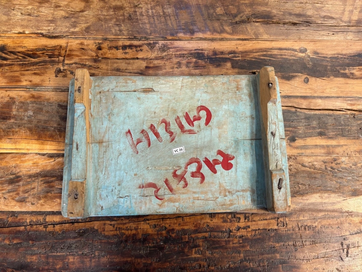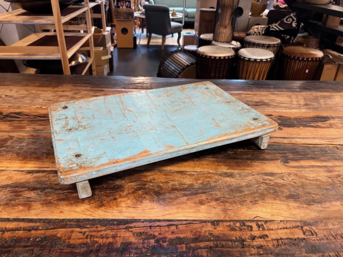 Gefertigt aus indischem Recyclingholz – etwa Teak, Mango oder Palisander – stammen die Tablare aus alten Abbruchhäusern. Jedes Stück trägt sichtbare Spuren seines früheren Lebens: mal mehr oder weniger türkise Farbe, teils mit roten Beschriftungen, die den individuellen Charakter betonen.