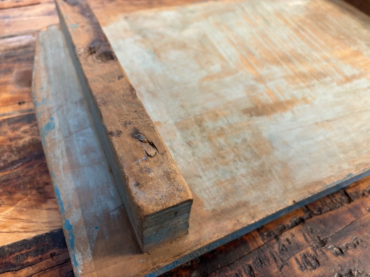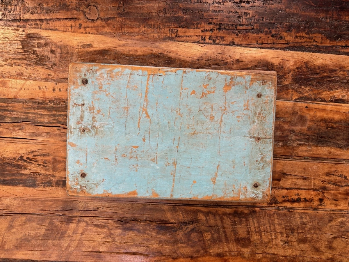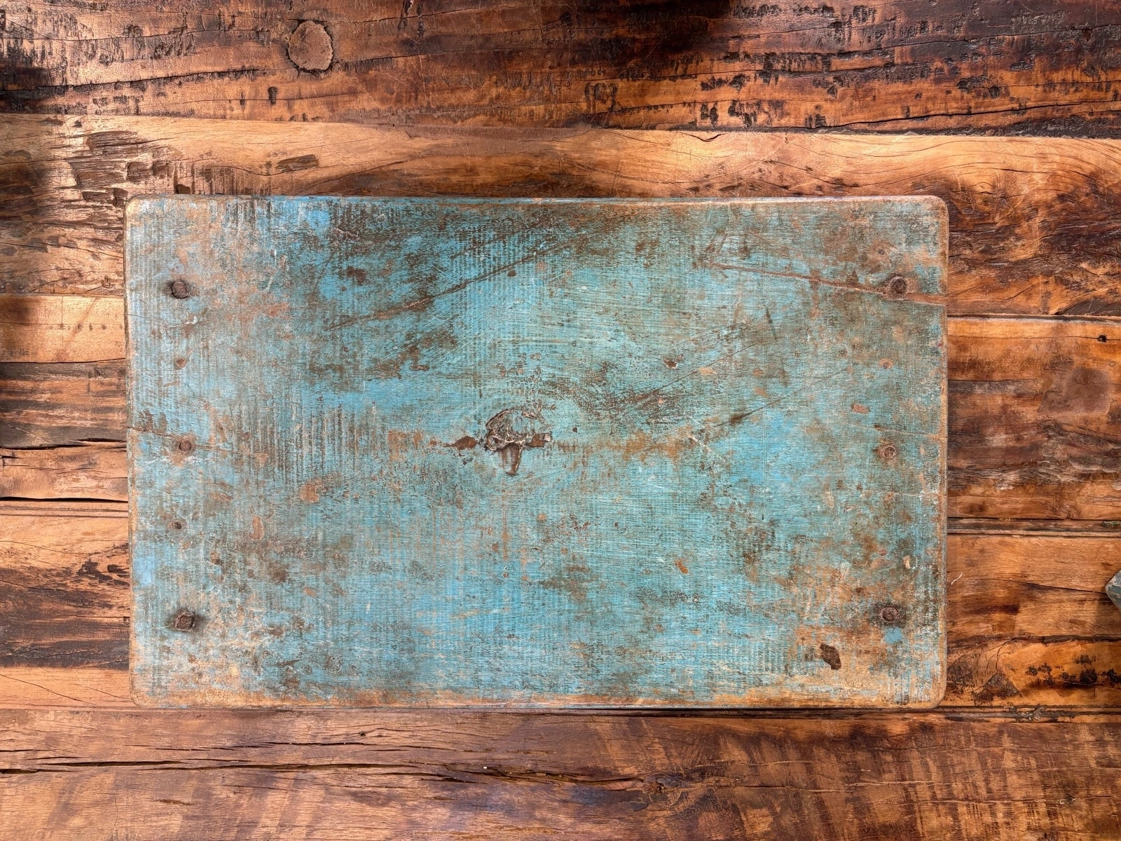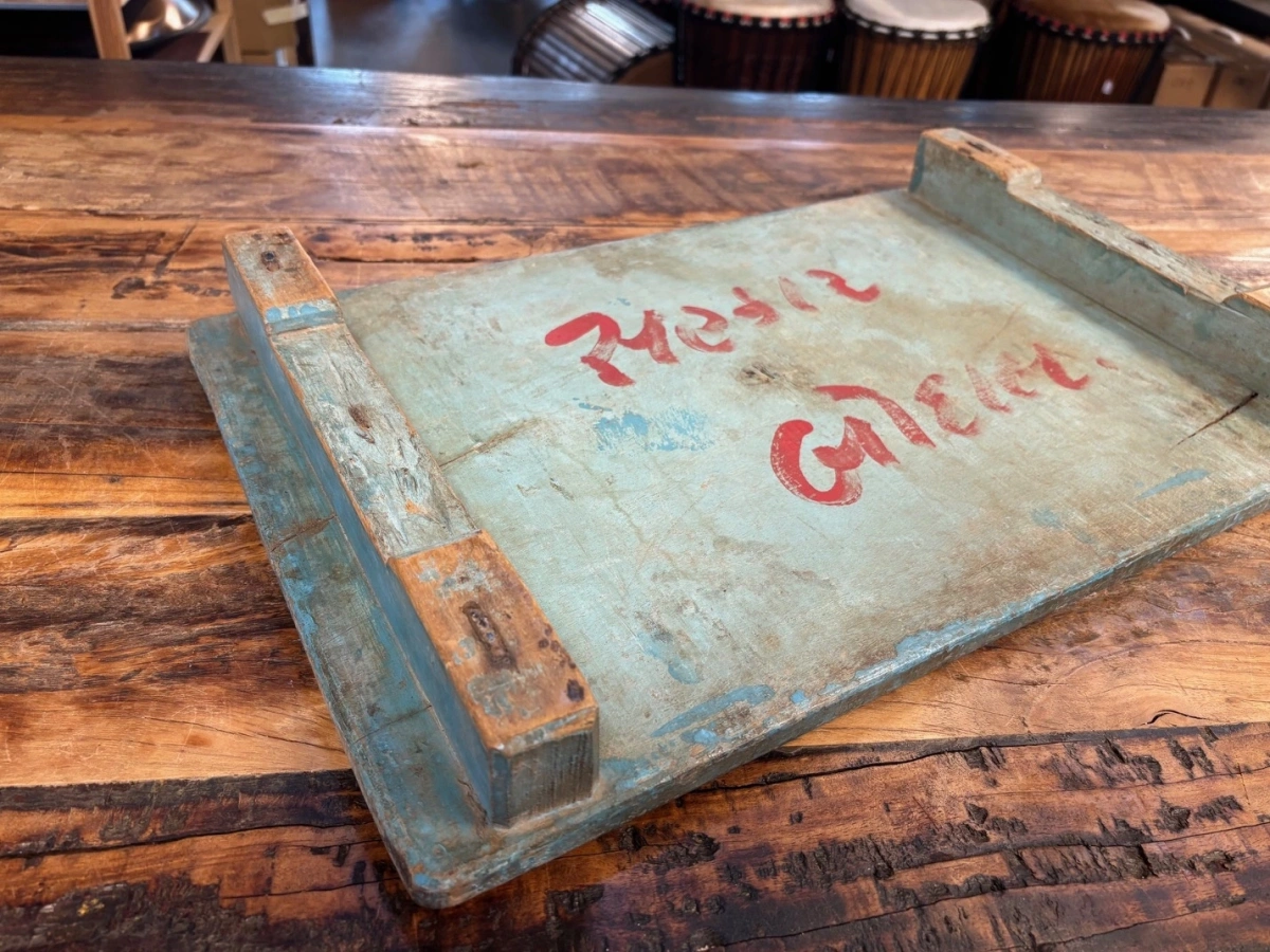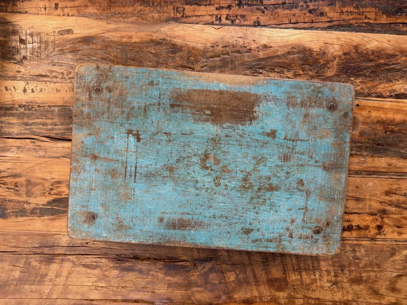 Curry-Tischlein aus Recyclingholz – handgefertigtes Tablar, ideal zum Essen, Malen, Arbeiten oder als kleiner Altar. Mit türkiser Farbe, teils roten Beschriftungen – jedes Stück ein einzigartiges Unikat. Maße ca. 50–55 × 32–34 × 6,5–7 cm.